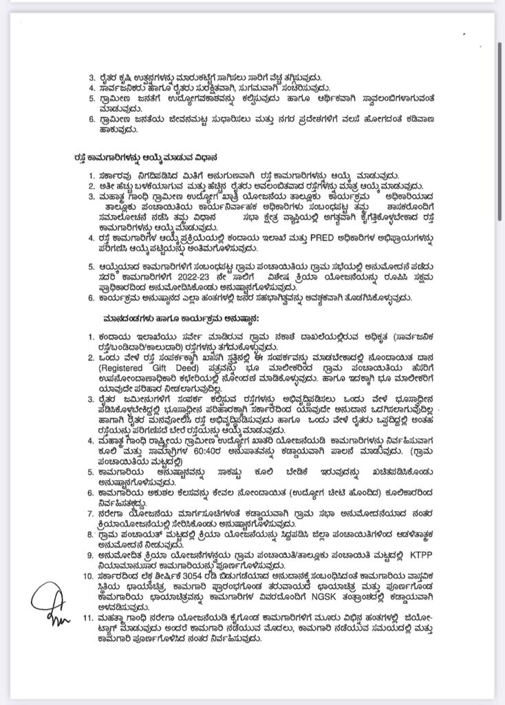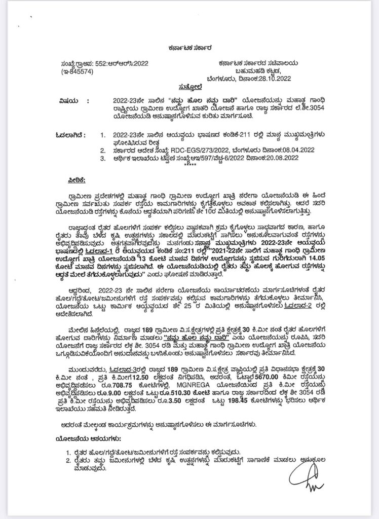 ಆದ್ದರಿಂದ, 2022-23 ನೇ ಸಾಲಿನ ನರೇಗಾ ಯೋಜನೆಯ ಕಾರ್ಯಾಚರಣೆಯ ಮಾರ್ಗಸೂಚಿಗಳಂತೆ ರೈತರ ಹೊಲ/ಗೆದ್ದೆ/ತೋಟ/ಜಮೀನುಗಳಿಗೆ ರಸ್ತೆ ಸಂಪರ್ಕವನ್ನು ಕಲ್ಪಿಸುವ ಕಾಮಗಾರಿಗಳನ್ನು ತೆಗೆದುಕೊಳ್ಳಲು ತೀರ್ಮಾನಿಸಿ, ಯೋಜನೆಯ ಒಟ್ಟು ಕಾರ್ಮಿಕ ಆಯವ್ಯಯದ ಶೇ 25 ರ ಮಿತಿಯಲ್ಲಿ ಅನುಷ್ಠಾನಗೊಳಿಸಲು ಓದಲಾದ-2 ರಲ್ಲಿ ಆದೇಶಿಸಲಾಗಿದೆ.