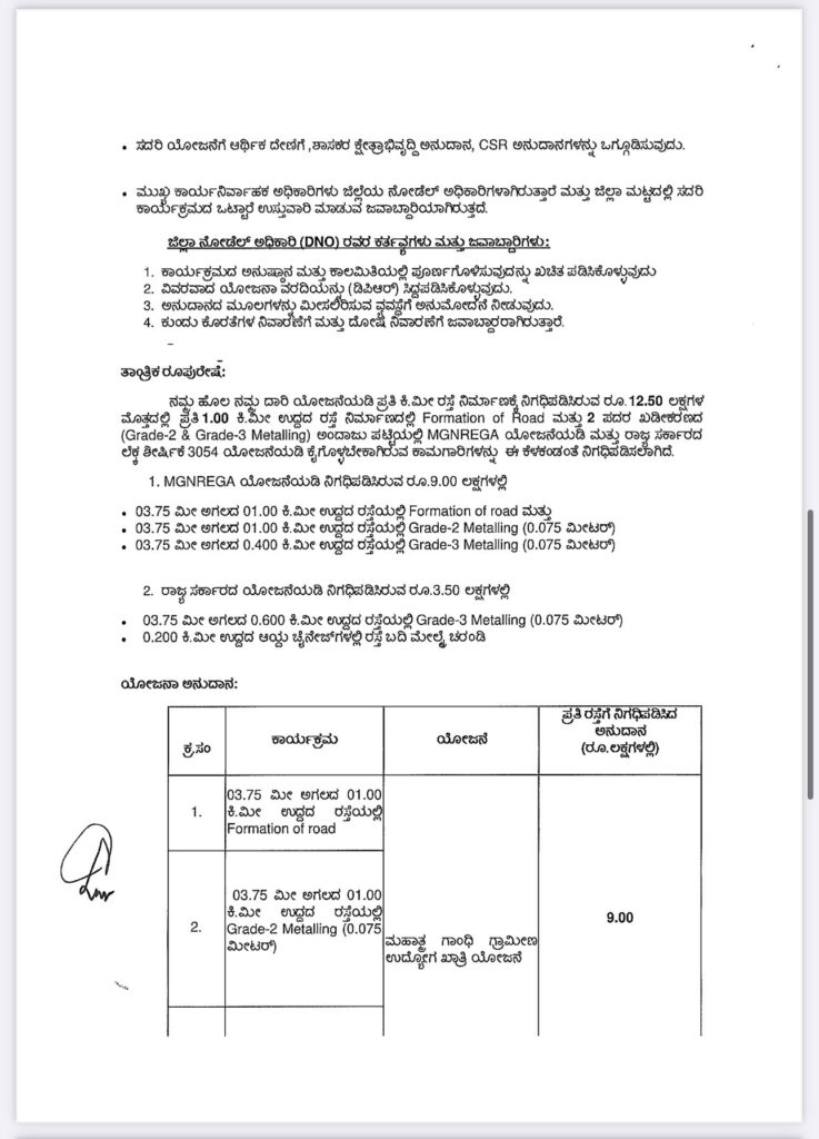 ಮುಂದುವರೆದು, ಓದಲಾದ 3ರಲ್ಲಿ ರಾಜ್ಯದ 189 ಗ್ರಾಮೀಣ ವಿ.ಸ.ಕ್ಷೇತ್ರ ವ್ಯಾಪ್ತಿಯಲ್ಲಿ ಪ್ರತಿ ವಿಧಾನಸಭಾ ಕ್ಷೇತ್ರಕ್ಕೆ 30 ಕಿ.ಮೀ ನಂತೆ, ಪ್ರತಿ ಕಿ.ಮೀಗೆ 12.50 ಲಕ್ಷದಂತೆ ನಿಗಧಿಪಡಿಸಿ, ಅದರಂತೆ, ಒಟ್ಟಾರೆ 5670.00 ಕಿಮೀ ರಸ್ತೆಯನ್ನು ಅಭಿವೃದ್ಧಿಪಡೆಸಲು ರೂ.708.75 ಕೋಟಿಗಳಲ್ಲಿ, MGNREGA ಯೋಜನೆಯಿಂದ ಪ್ರತಿ ಕಿ.ಮೀ ರಸ್ತೆಯನ್ನು ಅಭಿವೃದ್ಧಿಪಡಿಸಲು ರೂ.9.00 ಲಕ್ಷದಂತೆ ಒಟ್ಟು ರೂ.510.30 ಕೋಟಿ ಹಾಗೂ ರಾಜ್ಯ ಸರ್ಕಾರದಿಂದ ಲೆಕ್ಕ ಶೀ 3054 ರಸ್ತೆ ಪ್ರತಿ ಕಿ.ಮೀ ರಸ್ತೆಯನ್ನು ಅಭಿವೃದಿಪಡಿಸಲು ರೂ.3.50 ಲಕ್ಷದಂತೆ ಒಟ್ಟು 198.45 ಕೋಟಿಗಳನ್ನು ಭರಿಸಲು ಆರ್ಥಿಕ ಇಲಾಖೆಯು ಸಹಮತಿ ನೀಡಿರುತ್ತದೆ.