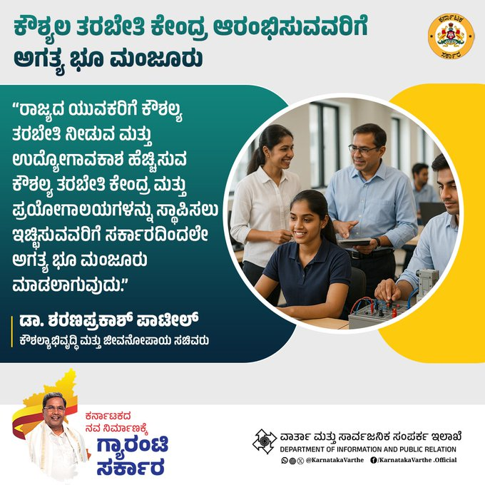 ಬೆಂಗಳೂರು: ರಾಜ್ಯದ ಯುವಕರಿಗೆ ಕೌಶಲ್ಯ ತರಬೇತಿ ನೀಡುವ ಮತ್ತು ಉದ್ಯೋಗಾವಕಾಶ ಹೆಚ್ಚಿಸುವ ಕೌಶಲ್ಯ ತರಬೇತಿ ಕೇಂದ್ರ ಮತ್ತು ಪ್ರಯೋಗಾಲಯಗಳನ್ನು ಸ್ಥಾಪಿಸಲು ಇಚ್ಛಿಸುವವರಿಗೆ ಸರ್ಕಾರದಿಂದಲೇ ಅಗತ್ಯ ಭೂ ಮಂಜೂರು ಮಾಡಲಾಗುವುದು ಎಂದು ಕೌಶಲ್ಯಾಭಿವೃದ್ಧಿ ಮತ್ತು ಜೀವನೋಪಾಯ ಸಚಿವ ಡಾ. ಶರಣಪ್ರಕಾಶ್ ಪಾಟೀಲ್ ತಿಳಿಸಿದ್ದಾರೆ.