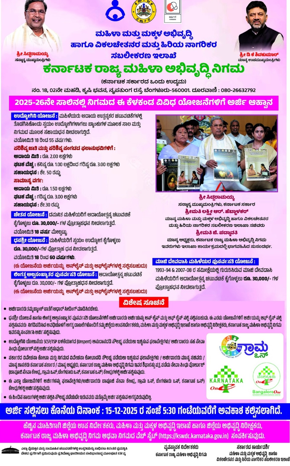 ಈ ಹಿಂದಿನ ಸಾಲುಗಳಲ್ಲಿ ಅರ್ಜಿಸಲ್ಲಿಸಿ ಸೌಲಭ್ಯ ಪಡೆಯದೇ ಇರುವವರು ಮತ್ತೊಮ್ಮೆ ಅರ್ಜಿ ಸಲ್ಲಿಸುವ ಅಗತ್ಯವಿರುವುದಿಲ್ಲ.ಅರ್ಜಿ ಸಲ್ಲಿಸಲು ಕೊನೆಯ ದಿನಾಂಕ : 15-12-2025 ರ ಸಂಜೆ 5:30 ಗಂಟೆಯವರೆಗೆ ಅವಕಾಶ ಕಲ್ಪಿಸಲಾಗಿದೆ. ಹೆಚ್ಚಿನ ಮಾಹಿತಿಗಾಗಿ ಜಿಲ್ಲೆಯ ಉಪ ನಿರ್ದೇಶಕರು, ಮಹಿಳಾ ಮತ್ತು ಮಕ್ಕಳ ಅಭಿವೃದ್ಧಿ ಇಲಾಖೆ ಹಾಗೂ ಜಿಲ್ಲೆಯ ಅಭಿವೃದ್ಧಿ ನಿರೀಕ್ಷಕರು, ಕರ್ನಾಟಕ ರಾಜ್ಯ ಮಹಿಳಾ ಅಭಿವೃದ್ಧಿ ನಿಗಮ ಅಥವಾ ನಿಗಮದ ವೆಬ್ ಸೈಟ್ (https://kswdc.karnataka.gov.in) ಸಂಪರ್ಕಿಸುವುದು.