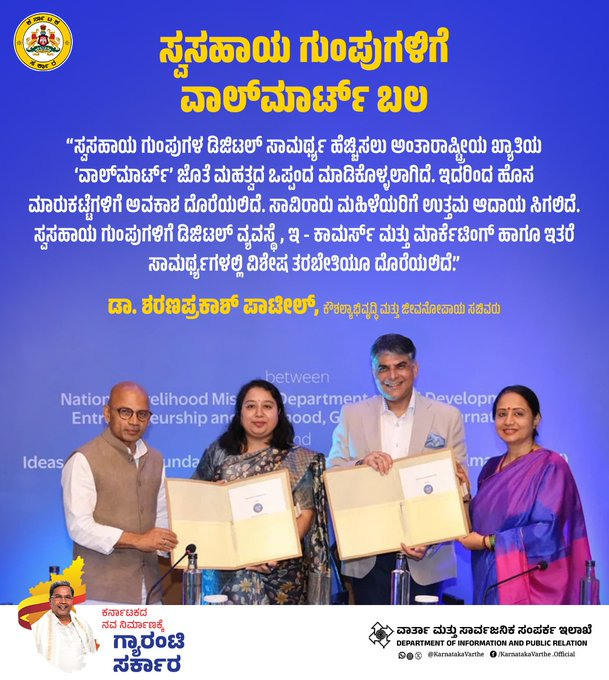 ಬೆಂಗಳೂರು: ಸ್ವಸಹಾಯ ಗುಂಪುಗಳ ಡಿಜಿಟಲ್‌ ಸಾಮರ್ಥ್ಯ ಹೆಚ್ಚಿಸಲು ಅಂತಾರಾಷ್ಟ್ರೀಯ ಖ್ಯಾತಿಯ ‘ವಾಲ್‌ಮಾರ್ಟ್‌’ ಜೊತೆ ಮಹತ್ವದ ಒಪ್ಪಂದ ಮಾಡಿಕೊಳ್ಳಲಾಗಿದೆ. ಇದರಿಂದ ಹೊಸ ಮಾರುಕಟ್ಟೆಗಳಿಗೆ ಅವಕಾಶ ದೊರೆಯಲಿದೆ.