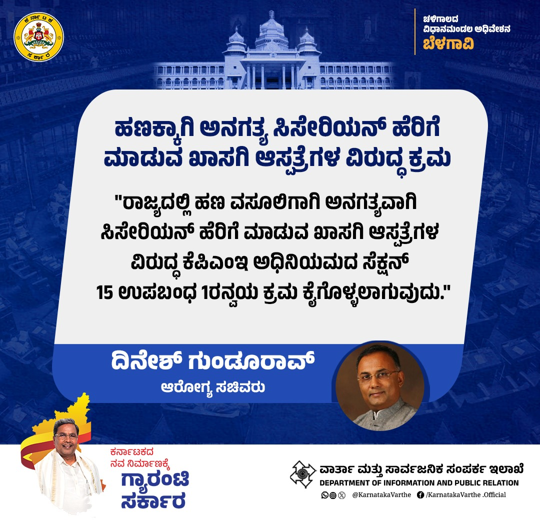 ಬೆಂಗಳೂರು : ರಾಜ್ಯದಲ್ಲಿ ಹಣ ವಸೂಲಿಗಾಗಿ ಅನಗತ್ಯವಾಗಿ ಸಿಸೇರಿಯನ್ ಹೆರಿಗೆ ಮಾಡುವ ಖಾಸಗಿ ಆಸ್ಪತ್ರೆಗಳ ವಿರುದ್ಧ ಕೆ.ಪಿ.ಎಂ.ಇ. ಅಧಿನಿಯಮದಂತೆ ಕ್ರಮ ಕೈಗೊಳ್ಳಲಾಗುವುದು ಎಂದು ಸಚಿವ ದಿನೇಶ್ ಗುಂಡೂರಾವ್ ಹೇಳಿದರು.