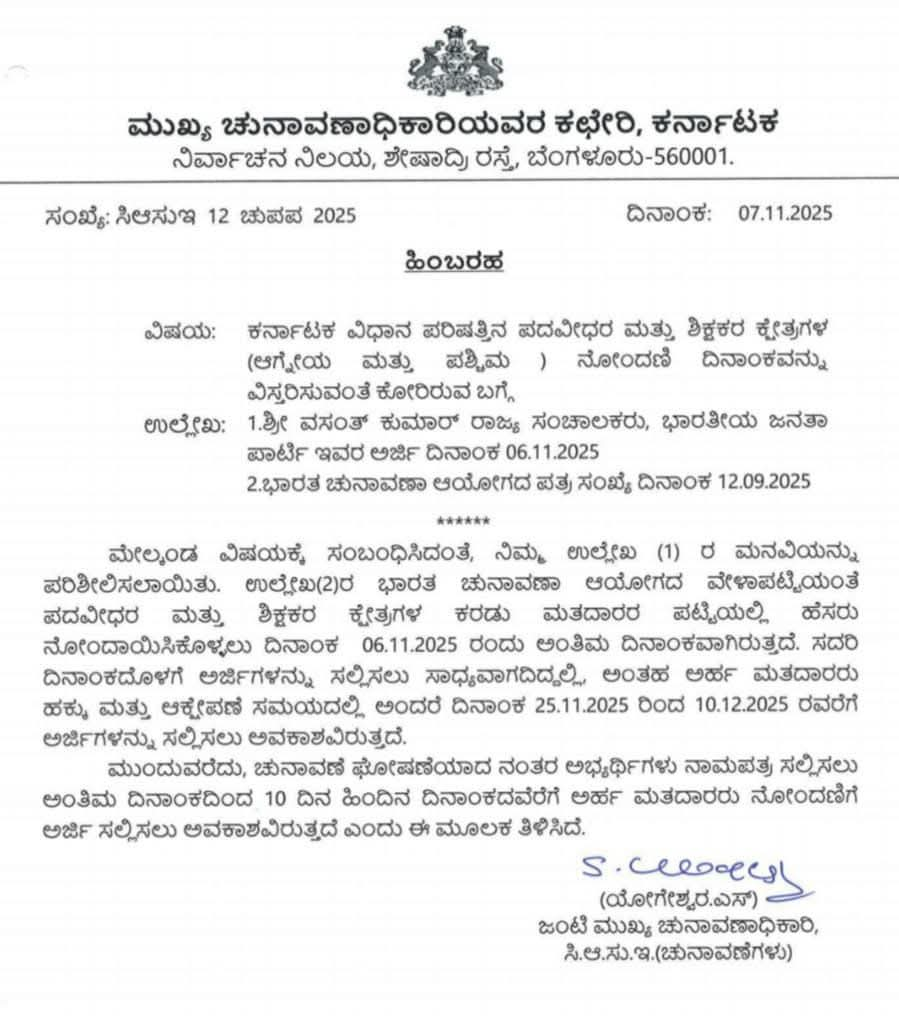 ಭಾರತ ಚುನಾವಣಾ ಆಯೋಗದ ವೇಳಾಪಟ್ಟಿಯಂತೆ ಪದವೀಧರ ಮತ್ತು ಶಿಕ್ಷಕರ ಕ್ಷೇತ್ರಗಳ ಕರಡು ಮತದಾರರ ಪಟ್ಟಿಯಲ್ಲಿ ಹೆಸರು ನೋಂದಾಯಿಸಿಕೊಳ್ಳಲು ದಿನಾಂಕ 06.11.2025 ರಂದು ಅಂತಿಮ ದಿನಾಂಕವಾಗಿರುತ್ತದೆ. ಸದರಿ ದಿನಾಂಕದೊಳಗೆ ಅರ್ಜಿಗಳನ್ನು ಸಲ್ಲಿಸಲು ಸಾಧ್ಯವಾಗದಿದ್ದಲ್ಲಿ, ಅಂತಹ ಅರ್ಹ ಮತದಾರರು ಹಕ್ಕು ಮತ್ತು ಆಕ್ಷೇಪಣೆ ಸಮಯದಲ್ಲಿ ಅಂದರೆ ದಿನಾಂಕ 25.11.2025 ರಿಂದ 10.12.2025 ರವರೆಗೆ ಅರ್ಜಿಗಳನ್ನು ಸಲ್ಲಿಸಲು ಅವಕಾಶವಿರುತ್ತದೆ.