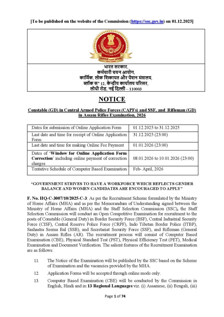 ಸ್ಟಾಫ್ ಸೆಲೆಕ್ಷನ್ ಕಮಿಷನ್ (ಎಸ್ಎಸ್ಸಿ) ಅಸ್ಸಾಂ ರೈಫಲ್ಸ್ನಲ್ಲಿ ಕೇಂದ್ರ ಸಶಸ್ತ್ರ ಪೊಲೀಸ್ ಪಡೆ (ಸಿಎಪಿಎಫ್ಗಳು), ಸೆಕ್ರೆಟರಿಯೇಟ್ ಸೆಕ್ಯುರಿಟಿ ಫೋರ್ಸ್ (ಎಸ್ಎಸ್ಎಫ್) ಮತ್ತು ರೈಫಲ್ಮ್ಯಾನ್ (ಜಿಡಿ) ಹುದ್ದೆಗಳಲ್ಲಿ 25,487 ಜನರಲ್ ಡ್ಯೂಟಿ (ಜಿಡಿ) ಕಾನ್ಸ್ಟೇಬಲ್ ಹುದ್ದೆಗಳಿಗೆ ಅರ್ಜಿಗಳನ್ನು ಆಹ್ವಾನಿಸಿದೆ.