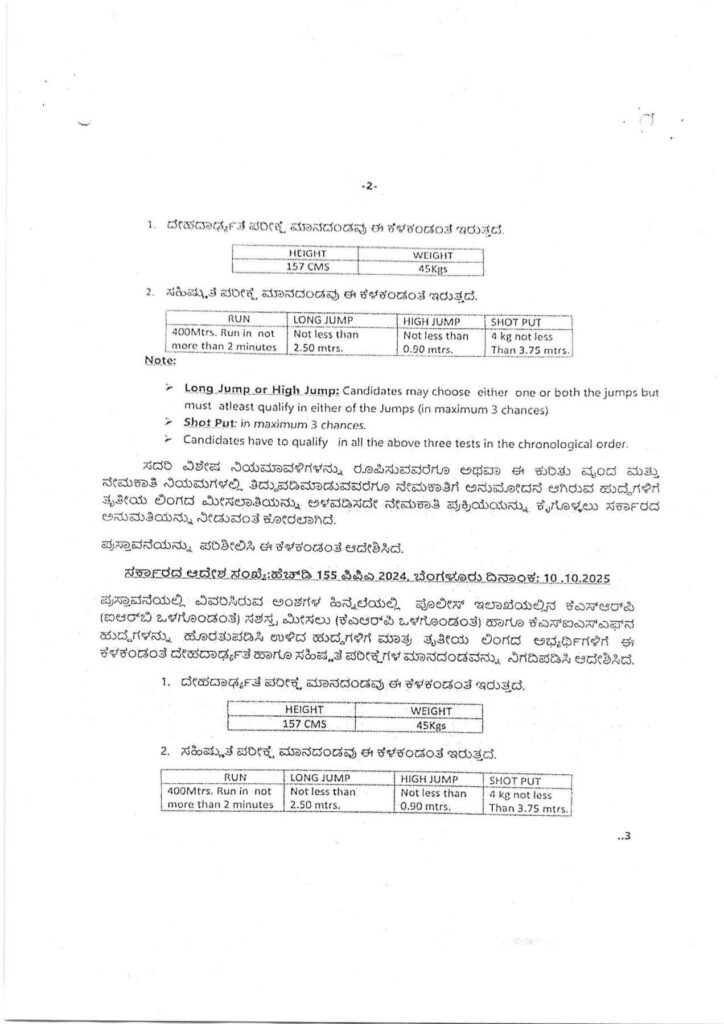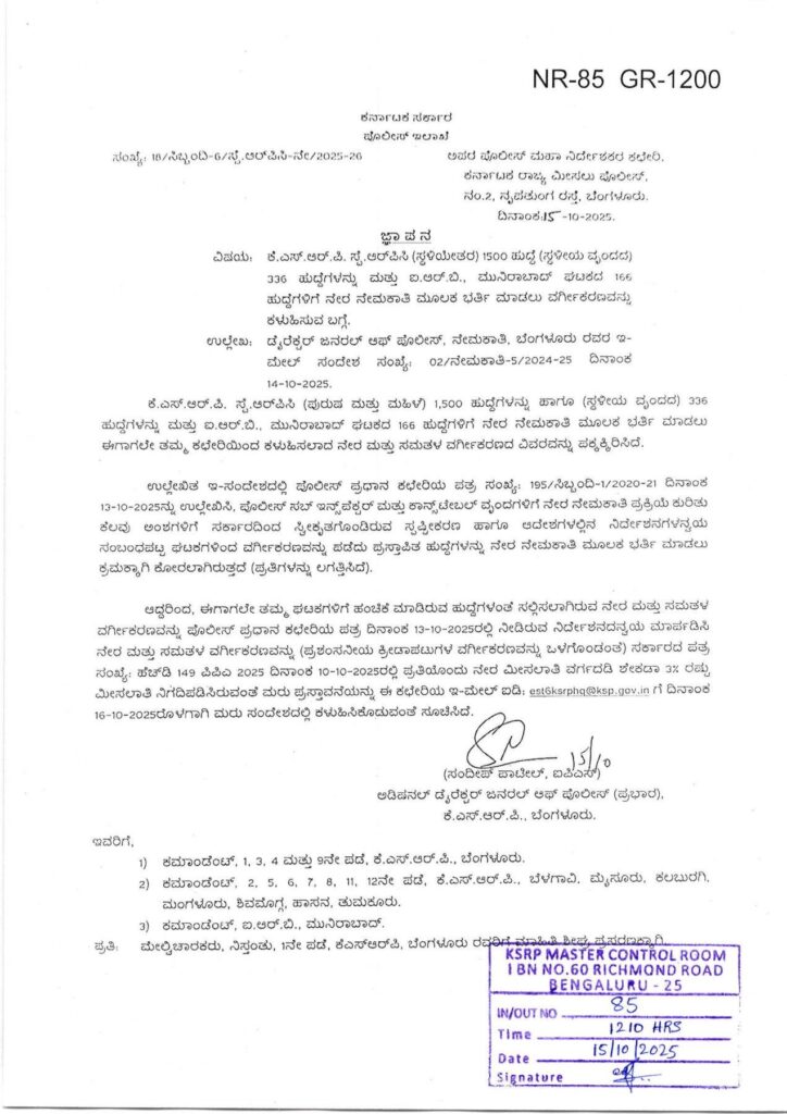 ಈ ಬಗ್ಗೆ ಸರ್ಕಾರ ಆದೇಶ ಹೊರಡಿಸಿದ್ದು, ಕೆ.ಎಸ್.ಆರ್.ಪಿ. ಸ್ಟೆ.ಆರ್ಪಿಸಿ (ಸ್ಥಳಿಯೇತರ) 1500 ಹುದ್ದೆ (ಸ್ಥಳೀಯ ವೃಂದದ) 336 ಹುದ್ದೆಗಳನ್ನು ಮತ್ತು ಬಿ.ಆರ್.ಬಿ.. ಮುನಿರಾಬಾದ್ ಘಟಕದ 166 ಹುದ್ದೆಗಳಿಗೆ ನೇರ ನೇಮಕಾತಿ ಮೂಲಕ ಭರ್ತಿ ಮಾಡಲು ವರ್ಗೀಕರಣವನ್ನು ಕಳುಹಿಸುವ ಬಗ್ಗೆ. ಡೈರೆಕ್ಟರ್ ಜನರಲ್ ಆಫ್ ಪೊಲೀಸ್, ನೇಮಕಾತಿ, ಬೆಂಗಳೂರು ರವರ ಇ-ಮೇಲ್ ಸಂದೇಶ ಸಂಖ್ಯೆ: 02/ನೇಮಕಾತಿ-5/2024-25 ದಿನಾಂಕ 14-10-2025.