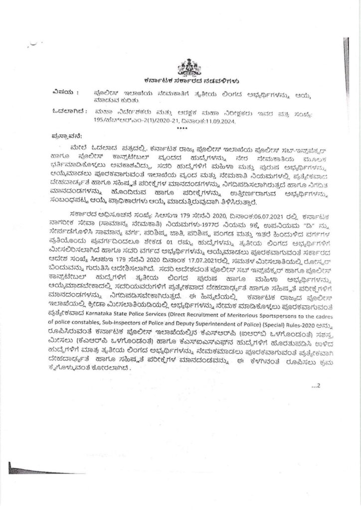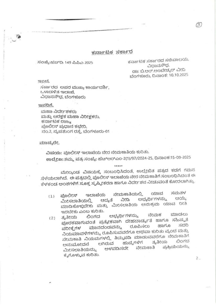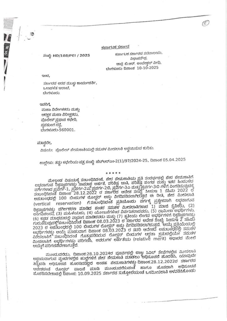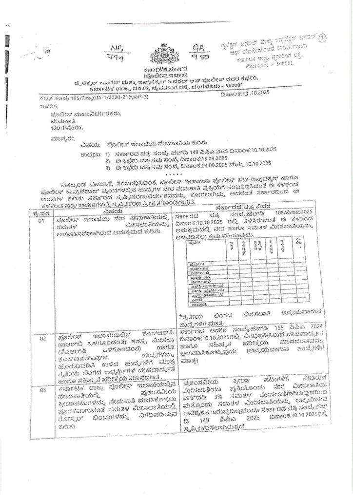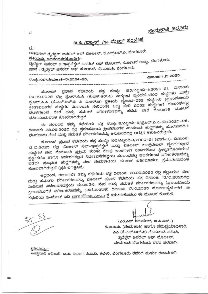 ಉಲ್ಲೇಖಿತ ಇ-ಸಂದೇಶದಲ್ಲಿ ಪೊಲೀಸ್ ಪ್ರಧಾನ ಕಛೇರಿಯ ಪತ್ರ ಸಂಖ್ಯೆ: 195/ಸಿಬ್ಬಂದಿ-1/2020-21 ದಿನಾಂಕ 13-10-2025ನ್ನು ಉಲ್ಲೇಖಿಸಿ, ಪೊಲೀಸ್ ಸಬ್ ಇನ್ಸ್ ಪೆಕ್ಟರ್ ಮತ್ತು ಕಾನ್ಸ್ ಟೇಬಲ್ ವೃಂದಗಳಿಗೆ ನೇರ ನೇಮಕಾತಿ ಪ್ರಕ್ರಿಯೆ ಕುರಿತು ಕೆಲವು ಅಂಶಗಳಿಗೆ ಸರ್ಕಾರದಿಂದ ಸ್ವೀಕೃತಗೊಂಡಿರುವ ಸ್ಪಷ್ಟಿಕರಣ ಹಾಗೂ ಆದೇಶಗಳಲ್ಲಿನ ನಿರ್ದೇಶನಗಳನ್ವಯ ಸಂಬಂಧಪಟ್ಟ ಘಟಕಗಳಿಂದ ವರ್ಗೀಕರಣವನ್ನು ಪಡೆದು ಪ್ರಸ್ತಾಪಿತ ಹುದ್ದೆಗಳನ್ನು ನೇರ ನೇಮಕಾತಿ ಮೂಲಕ ಭರ್ತಿ ಮಾಡಲು. ಕ್ರಮಕ್ಕಾಗಿ ಕೋರಲಾಗಿರುತ್ತದೆ (ಪ್ರತಿಗಳನ್ನು ಲಗತ್ತಿಸಿದೆ).