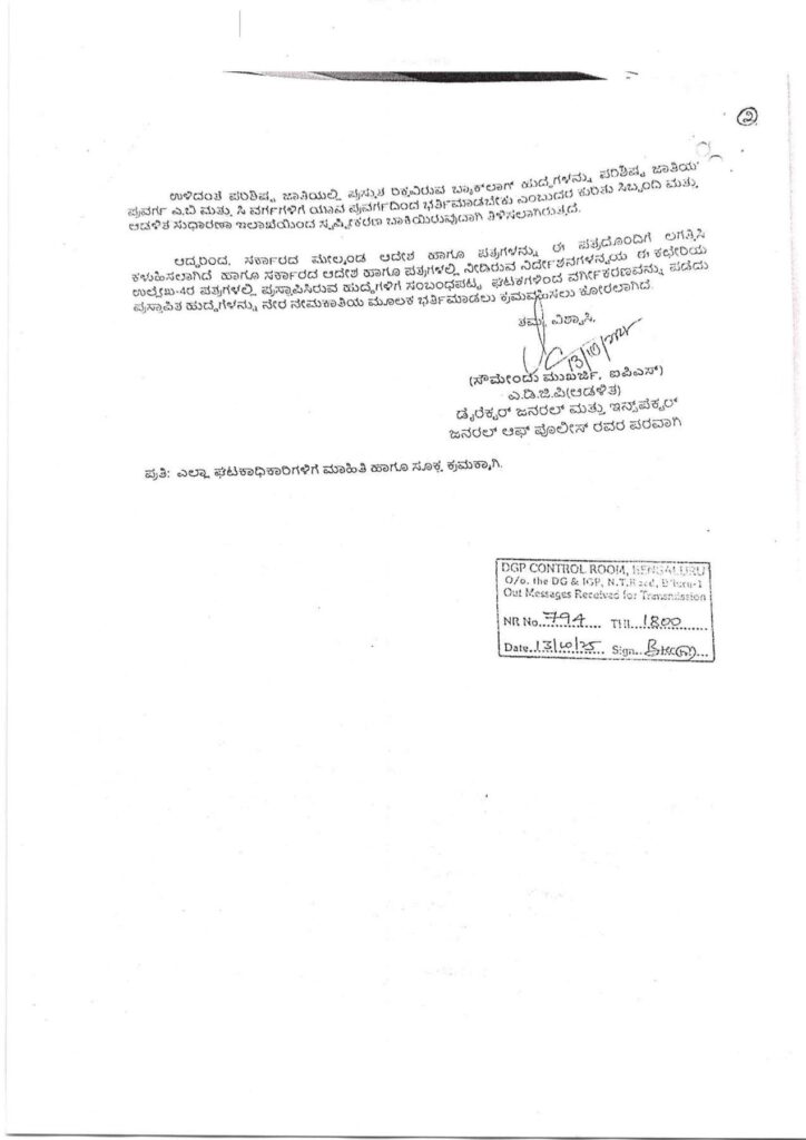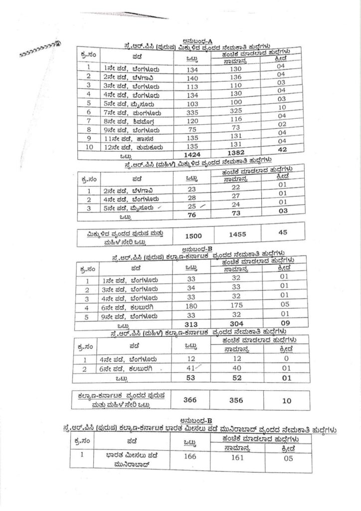 ಕೆ.ಎಸ್.ಆರ್.ಪಿ. ಸ್ಟೆ.ಆರ್ಪಿಸಿ (ಪುರುಷ ಮತ್ತು ಮಹಿಳೆ) 1,500 ಹುದ್ದೆಗಳನ್ನು ಹಾಗೂ (ಸ್ಥಳೀಯ ವೃಂದದ) 336 ಹುದ್ದೆಗಳನ್ನು ಮತ್ತು ಐ.ಆರ್.ಬಿ.. ಮುನಿರಾಬಾದ್ ಘಟಕದ 166 ಹುದ್ದೆಗಳಿಗೆ ನೇರ ನೇಮಕಾತಿ ಮೂಲಕ ಭರ್ತಿ ಮಾಡಲು ಈಗಾಗಲೇ ತಮ್ಮ ಕಛೇರಿಯಿಂದ ಕಳುಹಿಸಲಾದ ನೇರ ಮತ್ತು ಸಮತಳ ವರ್ಗೀಕರಣದ ವಿವರವನ್ನು ಪಕ್ಕಕ್ಕಿರಿಸಿದೆ.