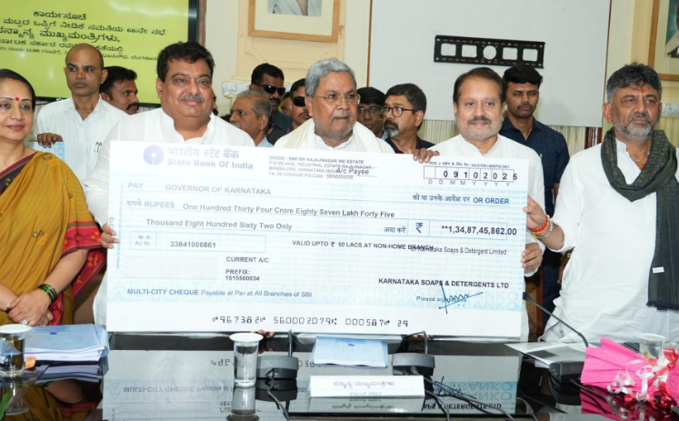 ಬೆಂಗಳೂರು : ಸಾರ್ವಜನಿಕ ವಲಯದ ಕರ್ನಾಟಕ ಸಾಬೂನು ಮತ್ತು ಮಾರ್ಜಕ ನಿಯಮಿತವು (KSDL) 2024-25ನೇ ಸಾಲಿನ ಲಾಭದಲ್ಲಿ 135 ಕೋಟಿ ರೂಪಾಯಿಗಳ ಚೆಕ್ ಅನ್ನು ಸರ್ಕಾರಕ್ಕೆ ಹಸ್ತಾಂತರಿಸಿತು.