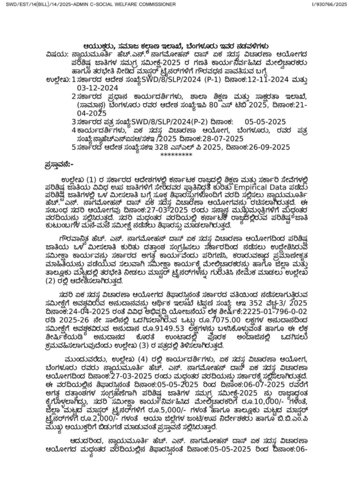ಪ್ರಸ್ತಾವನೆಯಲ್ಲಿ ವಿವರಿಸಿರುವಂತೆ, ನ್ಯಾಯಮೂರ್ತಿ ಹೆಚ್. ಎನ್. ನಾಗಮೋಹನ್ ದಾಸ್ ಏಕ ಸದಸ್ಯ ವಿಚಾರಣಾ ಆಯೋಗದ ಮಧ್ಯಂತರ ವರದಿಯಲ್ಲಿನ ಶಿಫಾರಸ್ಸಿನಂತೆ ದಿನಾಂಕ: 05-05-2025 ರಿಂದ ದಿನಾಂಕ:06-07-2025 ರವರೆಗೆ ಅಗತ್ಯ ದತ್ತಾಂಶಗಳ ಸಂಗ್ರಹಣೆಗಾಗಿ ಪರಿಶಿಷ್ಟ ಜಾತಿಗಳ ಸಮಗ್ರ ಸಮೀಕ್ಷೆ-2025 ರಲ್ಲಿ ಮೇಲ್ವಿಚಾರಕರಾಗಿ ರಾಜ್ಯಾದ್ಯಂತ ಸಮೀಕ್ಷಾ ಕಾರ್ಯನಿರ್ವಹಿಸಿದ ಪ್ರತಿ ಮೇಲ್ವಿಚಾರಕರಿಗೆ ತಲಾ ರೂ.10,000 ಸಂಭಾವನೆಯಂತೆ ಒಟ್ಟು ರೂ.5,22,60,000 ಗಳನ್ನು ಬಿಡುಗಡೆ ಮಾಡಲಾಗಿದೆ.