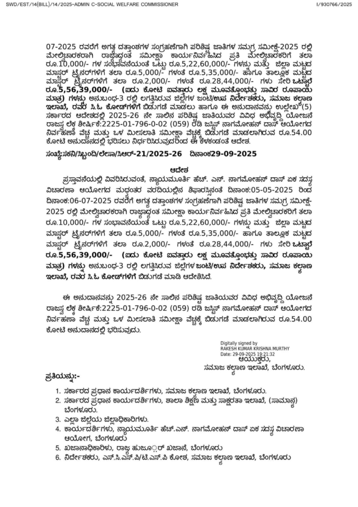 ಈ ಅನುದಾನವನ್ನು 2025-26 ನೇ ಸಾಲಿನ ಪರಿಶಿಷ್ಟ ಜಾತಿಯವರ ವಿವಿಧ ಅಭಿವೃದ್ಧಿ ಯೋಜನೆ ರಾಜಸ್ವ ಲೆಕ್ಕ ಶೀರ್ಷಿಕೆ:2225-01-796-0-02 (059) ರಡಿ ಜಸ್ಟಿಸ್ ನಾಗಮೋಹನ್ ದಾಸ್ ಆಯೋಗದ ನಿರ್ವಹಣಾ ವೆಚ್ಚ ಮತ್ತು ಒಳ ಮೀಸಲಾತಿ ಸಮೀಕ್ಷಾ ವೆಚ್ಚಕ್ಕೆ ಬಿಡುಗಡೆ ಮಾಡಲಾಗಿರುವ ರೂ.54.00 ಕೋಟಿ ಅನುದಾನದಲ್ಲಿ ಭರಿಸುವುದು ಎಂದು ತಿಳಿಸಲಾಗಿದೆ.