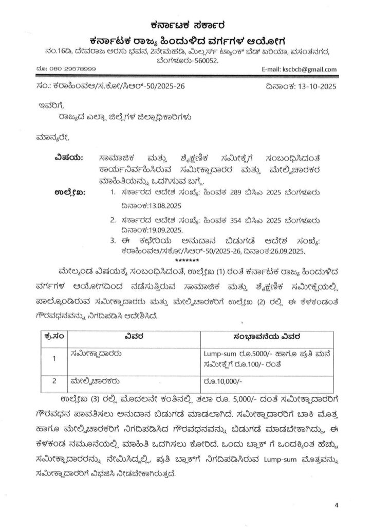 ಮೇಲ್ಕಂಡ ವಿಷಯಕ್ಕೆ ಸಂಬಂಧಿಸಿದಂತೆ, ಉಲ್ಲೇಖ (1) ರಂತೆ ಕರ್ನಾಟಕ ರಾಜ್ಯ ಹಿಂದುಳಿದ ವರ್ಗಗಳ ಆಯೋಗದಿಂದ ನಡೆಸುತ್ತಿರುವ ಸಾಮಾಜಿಕ ಮತ್ತು ಶೈಕ್ಷಣಿಕ ಸಮೀಕ್ಷೆಯಲ್ಲಿ ಪಾಲ್ಗೊಂಡಿರುವ ಸಮೀಕ್ಷಾದಾರರು ಮತ್ತು ಮೇಲ್ವಿಚಾರಕರಿಗೆ ಉಲ್ಲೇಖ (2) ರಲ್ಲಿ ಈ ಕೆಳಕಂಡಂತೆ ಗೌರವಧನವನ್ನು ನಿಗದಿಪಡಿಸಿ ಆದೇಶಿಸಿದೆ.
