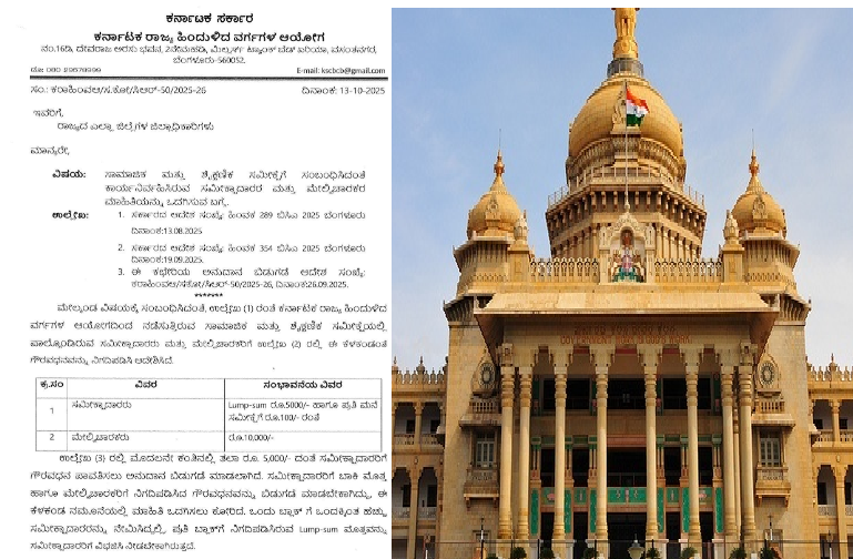ಮೇಲ್ಕಂಡ ವಿಷಯಕ್ಕೆ ಸಂಬಂಧಿಸಿದಂತೆ, ಉಲ್ಲೇಖ (1) ರಂತೆ ಕರ್ನಾಟಕ ರಾಜ್ಯ ಹಿಂದುಳಿದ ವರ್ಗಗಳ ಆಯೋಗದಿಂದ ನಡೆಸುತ್ತಿರುವ ಸಾಮಾಜಿಕ ಮತ್ತು ಶೈಕ್ಷಣಿಕ ಸಮೀಕ್ಷೆಯಲ್ಲಿ ಪಾಲ್ಗೊಂಡಿರುವ ಸಮೀಕ್ಷಾದಾರರು ಮತ್ತು ಮೇಲ್ವಿಚಾರಕರಿಗೆ ಉಲ್ಲೇಖ (2) ರಲ್ಲಿ ಈ ಕೆಳಕಂಡಂತೆ ಗೌರವಧನವನ್ನು ನಿಗದಿಪಡಿಸಿ ಆದೇಶಿಸಿದೆ.