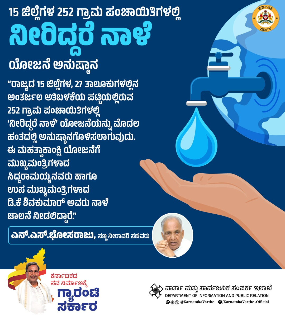 ರಾಜ್ಯದ 15 ಜಿಲ್ಲೆಗಳ, 27 ತಾಲೂಕುಗಳಲ್ಲಿನ ಅಂತರ್ಜಲ ಅತಿಬಳಕೆಯ ಪಟ್ಟಿಯಲ್ಲಿರುವ 252 ಗ್ರಾಮ ಪಂಚಾಯಿತಿಗಳಲ್ಲಿ ʼನೀರಿದ್ದರೆ ನಾಳೆʼ ಯೋಜನೆಯನ್ನು ಮೊದಲ ಹಂತದಲ್ಲಿ ಅನುಷ್ಠಾನಗೊಳಿಸಲಾಗುವುದು. ಈ ಮಹತ್ವಾಕಾಂಕ್ಷಿ ಯೋಜನೆಗೆ ಮುಖ್ಯಮಂತ್ರಿಗಳಾದ ಸಿದ್ದರಾಮಯ್ಯನವರು ಹಾಗೂ ಉಪ ಮುಖ್ಯಮಂತ್ರಿಗಳಾದ ಡಿಕೆ ಶಿವಕುಮಾರ್ ಅವರು ಚಾಲನೆ ನೀಡಲಿದ್ದಾರೆ ಎಂದು ಸಣ್ಣ ನೀರಾವರಿ ಸಚಿವರಾದ ಕೆ.ಎನ್ ಬೋಸರಾಜು ಅವರು ತಿಳಿಸಿದ್ದಾರೆ.