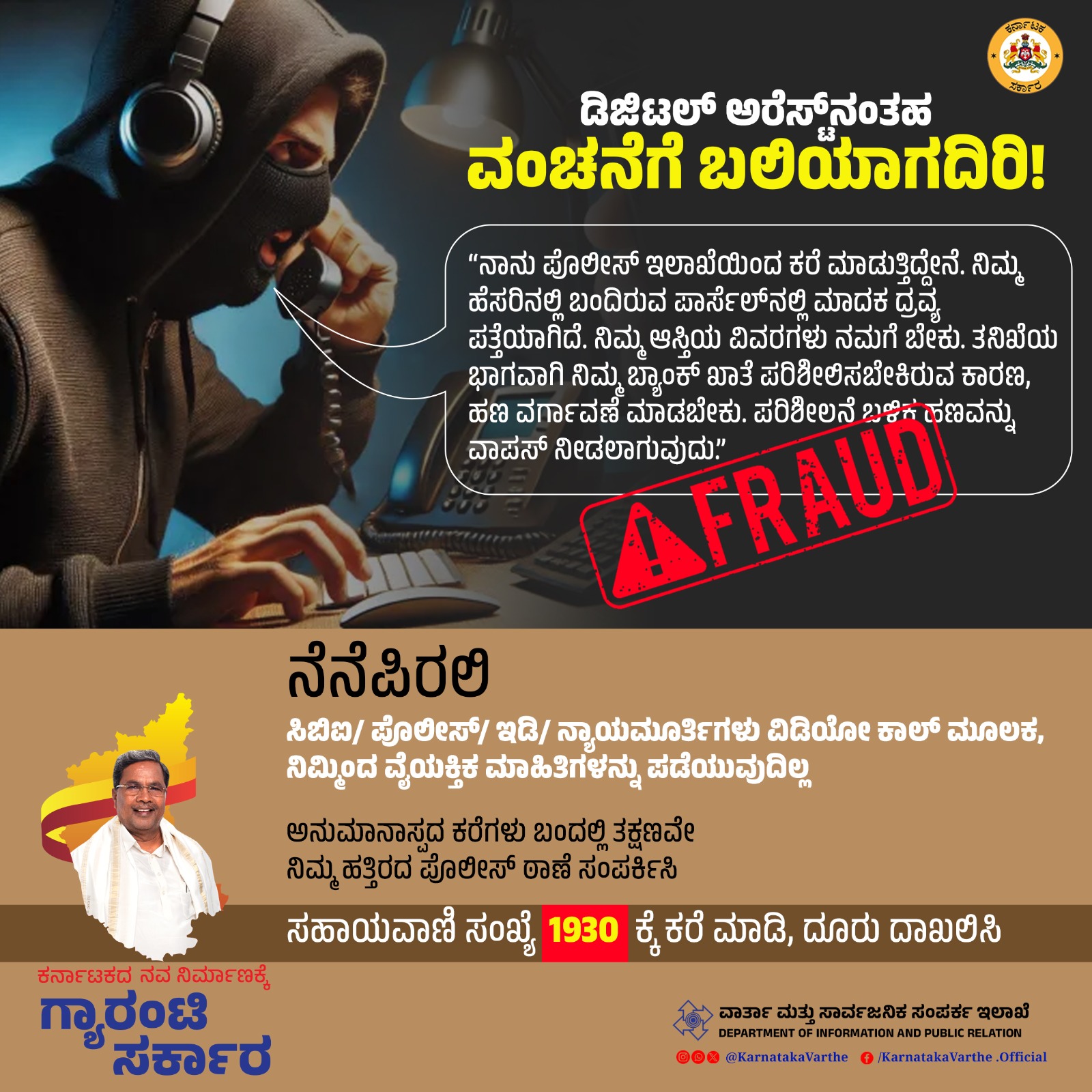 ಬೆಂಗಳೂರು : ಸಾರ್ವಜನಿಕರಿಗೆ ಸರ್ಕಾರ ಮಹತ್ವದ ಪ್ರಕಟಣೆ ಹೊರಡಿಸಿದ್ದು, ಈ ರೀತಿ ‘ಡಿಜಿಟಲ್ ಅರೆಸ್ಟ್’ ವಂಚನೆಗೆ ಬಲಿಯಾಗದಿರಿ ಎಂದು ಎಚ್ಚರಿಕೆ ನೀಡಿದೆ.