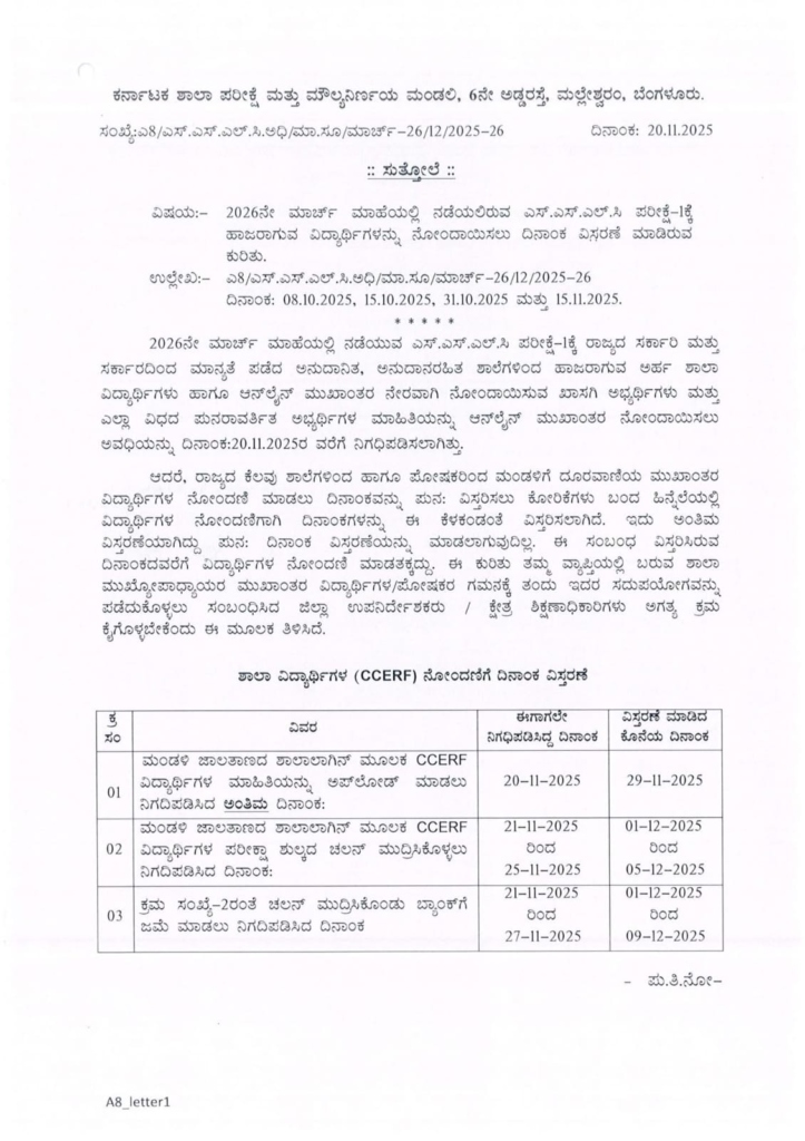 ಬೆಂಗಳೂರು: 2026ನೇ ಮಾರ್ಚ್ ಮಾಹೆಯಲ್ಲಿ ನಡೆಯಲಿರುವ ಎಸ್.ಎಸ್.ಎಲ್.ಸಿ. ಪರೀಕ್ಷೆ-1ಕ್ಕೆ ಹಾಜರಾಗುವ ವಿದ್ಯಾರ್ಥಿಗಳನ್ನು ನೋಂದಾಯಿಸಲು ದಿನಾಂಕ ವಿಸರಣೆ ಮಾಡಲಾಗಿದೆ.
