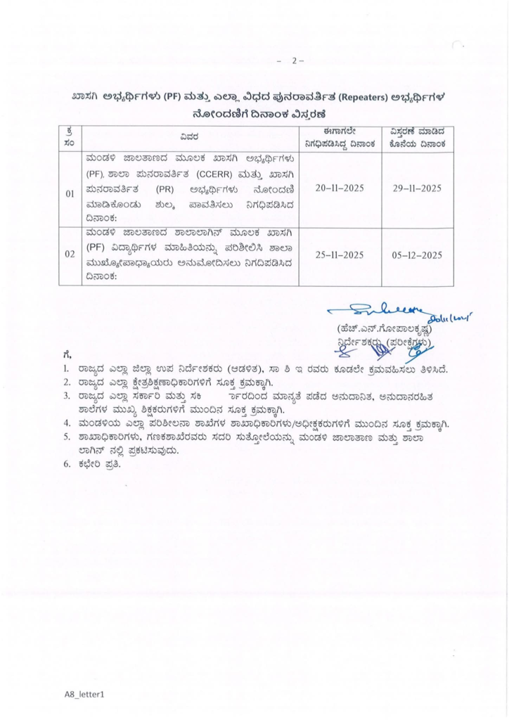 ಕರ್ನಾಟಕ ಶಾಲಾ ಪರೀಕ್ಷೆ ಮತ್ತು ಮೌಲ್ಯ ನಿರ್ಣಯ ಮಂಡಳಿ ಮತ್ತೆ ದಿನಾಂಕ ವಿಸ್ತರಿಸಿದ್ದು, ನವೆಂಬರ್ 29 ರವರೆಗೆ ಎಸ್ಎಸ್ಎಲ್ಸಿ ಪರೀಕ್ಷೆ-1 ನೋಂದಾಯಿಸಿಕೊಳ್ಳಬಹುದಾಗಿದೆ. ಸರ್ಕಾರಿ, ಅನುದಾನಿತ, ಅನುದಾನ ರಹಿತ ಶಾಲೆಗಳ ವಿದ್ಯಾರ್ಥಿಗಳು, ಖಾಸಗಿ ಅಭ್ಯರ್ಥಿಗಳು, ಪುನರಾವರ್ತಿತ ವಿದ್ಯಾರ್ಥಿಗಳು ಪ್ರಯೋಜನ ಪಡೆದುಕೊಳ್ಳುವಂತೆ ತಿಳಿಸಲಾಗಿದೆ.