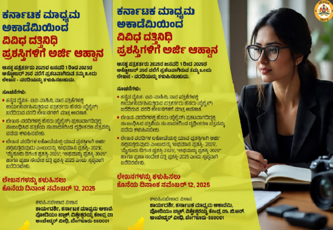 ಕರ್ನಾಟಕ ಮಾಧ್ಯಮ ಅಕಾಡೆಮಿಯು 2025ನೇ ಸಾಲಿನ ವಿವಿಧ ದತ್ತಿನಿಧಿ ಪ್ರಶಸ್ತಿಗಳಿಗಾಗಿ ಪತ್ರಕರ್ತರಿಂದ ಲೇಖನಗಳನ್ನು ಆಹ್ವಾನಿಸಿದೆ.