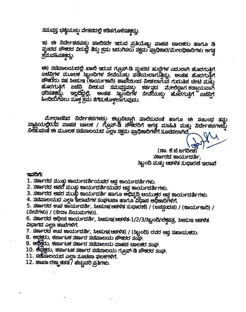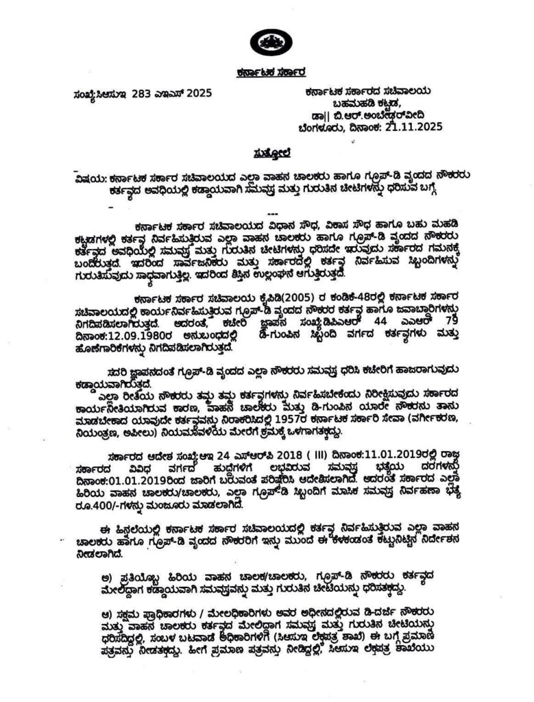 ಈ ಹಿನ್ನಲೆಯಲ್ಲಿ ಕರ್ನಾಟಕ ಸರ್ಕಾರ ಸಚಿವಾಲಯದಲ್ಲಿ ಕರ್ತವ್ಯ ನಿರ್ವಹಿಸುತ್ತಿರುವ ಎಲ್ಲಾ ವಾಹನ ಚಾಲಕರು ಹಾಗೂ ಗ್ರೂಪ್-ಡಿ ವೃಂದದ ನೌಕರರಿಗೆ ಇನ್ನು ಮುಂದೆ ಈ ಕೆಳಕಂಡಂತೆ ಕಟ್ಟುನಿಟ್ಟಿನ ನಿರ್ದೇಶನ ನೀಡಲಾಗಿದೆ.