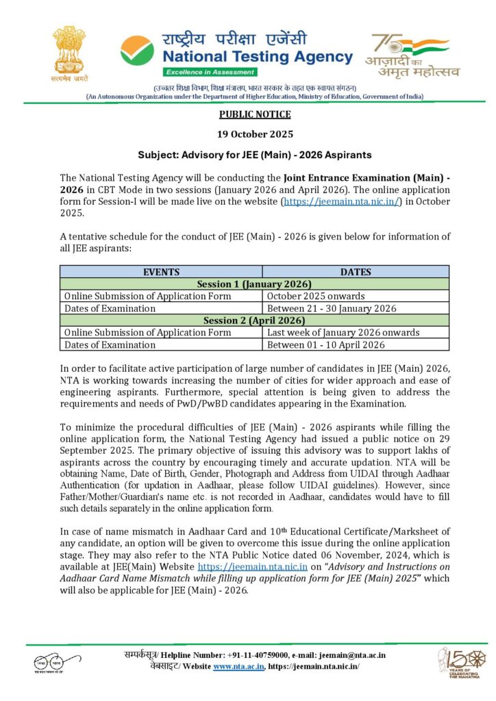 2026-27ರ ಶೈಕ್ಷಣಿಕ ವರ್ಷದ JEE ಮುಖ್ಯ 2026 ಪರೀಕ್ಷೆಗಳ ಮೊದಲ ಹಂತದ ವೇಳಾಪಟ್ಟಿಯನ್ನು ಇತ್ತೀಚೆಗೆ ಬಿಡುಗಡೆ ಮಾಡಲಾಗಿದೆ ಎಂದು ತಿಳಿದಿದೆ. ಈ ವೇಳಾಪಟ್ಟಿಯ ಪ್ರಕಾರ, JEE ಮುಖ್ಯ ಪರೀಕ್ಷೆಗಳ ಮೊದಲ ಹಂತವು ಜನವರಿ 21 ರಿಂದ 30 ರವರೆಗೆ ಮತ್ತು ಎರಡನೇ ಹಂತವು ಏಪ್ರಿಲ್ 1 ರಿಂದ 10 ರವರೆಗೆ ನಡೆಯಲಿದೆ. ಪರೀಕ್ಷೆಯು ದಿನಕ್ಕೆ ಎರಡು ಪಾಳಿಗಳಲ್ಲಿ ನಡೆಯಲಿದೆ. ಈ ಮಟ್ಟಿಗೆ, ರಾಷ್ಟ್ರೀಯ ಪರೀಕ್ಷಾ ಸಂಸ್ಥೆ (NTA) ಭಾನುವಾರ ಪರೀಕ್ಷಾ ದಿನಾಂಕಗಳನ್ನು ಪ್ರಕಟಿಸಿದೆ. ಈ ಬಾರಿ ಈ ಪರೀಕ್ಷೆಗಳ ದಿನಾಂಕಗಳನ್ನು ಕಳೆದ ವರ್ಷಕ್ಕಿಂತ 10 ದಿನ ಮುಂಚಿತವಾಗಿ ಘೋಷಿಸಲಾಗಿದೆ ಎಂಬುದು ಗಮನಾರ್ಹ. ಆದರೆ, ಆನ್ಲೈನ್ ಅರ್ಜಿಗಳನ್ನು ಸ್ವೀಕರಿಸುವ ದಿನಾಂಕವನ್ನು ಇನ್ನೂ ಘೋಷಿಸಲಾಗಿಲ್ಲ. ಆ ಪ್ರಕ್ರಿಯೆಯೂ ಈ ತಿಂಗಳು ಪ್ರಾರಂಭವಾಗುವ ಸಾಧ್ಯತೆ ಇದೆ ಎಂದು ತಿಳಿದುಬಂದಿದೆ.