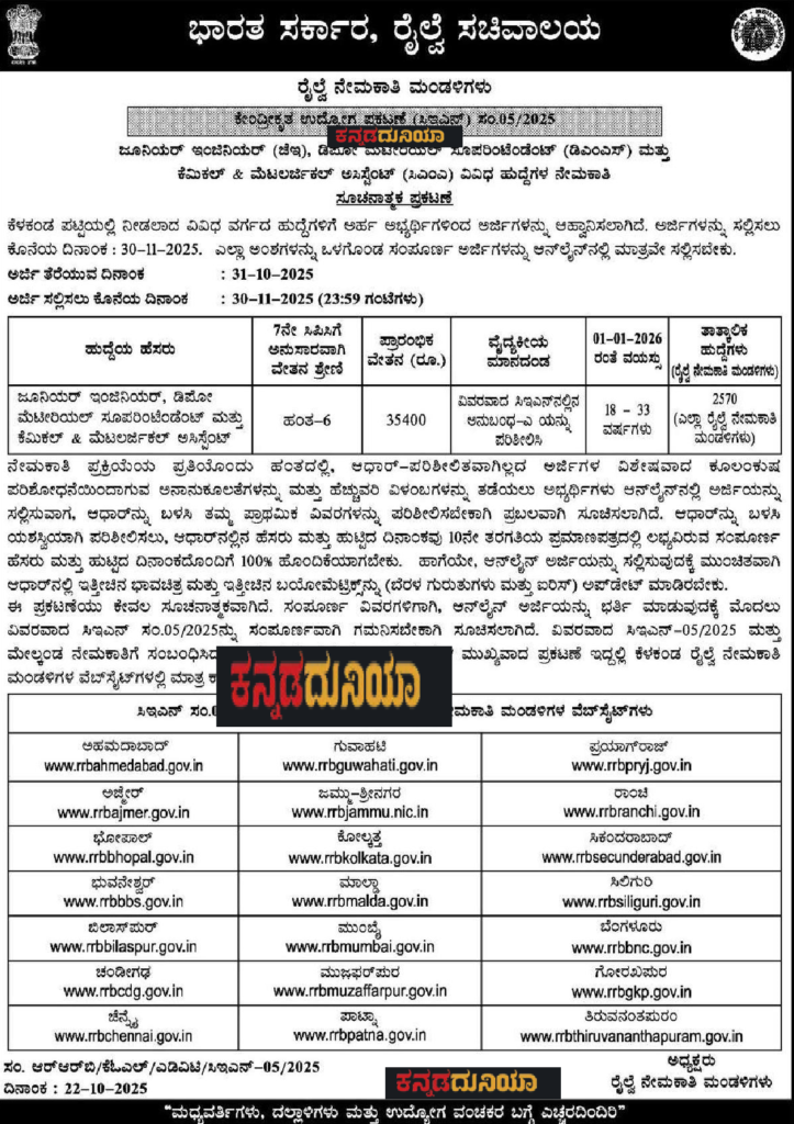 ರೈಲ್ವೆ ನೇಮಕಾತಿ ಮಂಡಳಿಗಳು (RRBs) CEN ಸಂಖ್ಯೆ 05/2025 ರ ಅಡಿಯಲ್ಲಿ ಜೂನಿಯರ್ ಎಂಜಿನಿಯರ್ (JE), ಡಿಪೋ ಮೆಟೀರಿಯಲ್ ಸೂಪರಿಂಟೆಂಡೆಂಟ್ (DMS), ಮತ್ತು ಕೆಮಿಕಲ್ & ಮೆಟಲರ್ಜಿಕಲ್ ಅಸಿಸ್ಟೆಂಟ್ (CMA) ಹುದ್ದೆಗಳಿಗೆ 2570 ಖಾಲಿ ಹುದ್ದೆಗಳನ್ನು ಘೋಷಿಸುವ ಕಿರು ಸೂಚನೆಯನ್ನು ಅಧಿಕೃತವಾಗಿ ಬಿಡುಗಡೆ ಮಾಡಿದೆ. ಅಕ್ಟೋಬರ್ 31, 2025 ರಂದು ಆನ್ಲೈನ್ ಅರ್ಜಿಗಳು ಪ್ರಾರಂಭವಾಗಲಿದ್ದು, ಭಾರತೀಯ ರೈಲ್ವೆಯಲ್ಲಿ ಪ್ರತಿಷ್ಠಿತ ಸರ್ಕಾರಿ ಉದ್ಯೋಗವನ್ನು ಪಡೆಯಲು ತಾಂತ್ರಿಕ ಆಕಾಂಕ್ಷಿಗಳಿಗೆ ಇದು ಅತ್ಯುತ್ತಮ ಅವಕಾಶವಾಗಿದೆ.