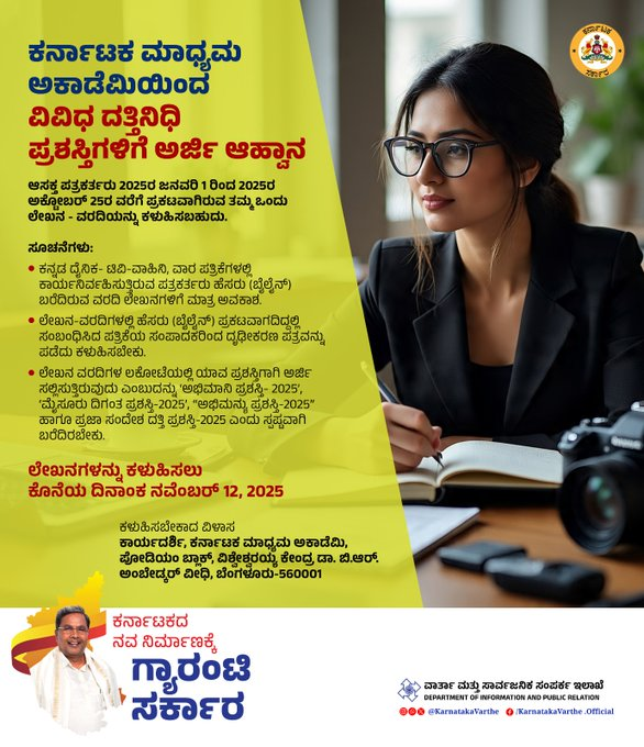 ಬೆಂಗಳೂರು: ಕರ್ನಾಟಕ ಮಾಧ್ಯಮ ಅಕಾಡೆಮಿಯು 2025ನೇ ಸಾಲಿನ ವಿವಿಧ ದತ್ತಿನಿಧಿ ಪ್ರಶಸ್ತಿಗಳಿಗಾಗಿ ಪತ್ರಕರ್ತರಿಂದ ಲೇಖನಗಳನ್ನು ಆಹ್ವಾನಿಸಿದೆ.