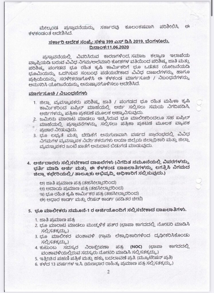 ಪ್ರಸ್ತಾವನೆಯಲ್ಲಿ ವಿವರಿಸಿರುವ ಕಾರಣಗಳಿಂದ, ಸಮಾಜ ಕಲ್ಯಾಣ ಇಲಾಖೆಯ ವ್ಯಾಪ್ತಿಯಡಿ ಬರುವ ವಿವಿಧ ನಿಗಮ/ಅಲೆಮಾರಿ ಕೋಶಗಳ ವತಿಯಿಂದ ಪರಿಶಿಷ್ಟ ಜಾತಿ ಮತ್ತು ಪರಿಶಿಷ್ಟ ಪಂಗಡದ ಭೂ ರಹಿತ ಕೃಷಿ ಕಾರ್ಮಿಕರಿಗೆ ಭೂ ಒಡೆತನ ಯೋಜನೆಯಡಿ ಭೂಮಿಯನ್ನು ಒದಗಿಸುವ ಸಂಬಂಧ ಪಡೆಯಬೇಕಾದ ವಿವಿಧ ದಾಖಲೆಗಳನ್ನು ಹಾಗೂ ಪ್ರಕ್ರಿಯೆಯನ್ನು ಸರಳೀಕರಣಗೊಳಿಸಿ ಈ ಕೆಳಕಂಡ ಮಾರ್ಗಸೂಚಿ / ನಿಬಂಧನೆಗಳನ್ನು ಅನುಸರಿಸಿ ಯೋಜನೆಯನ್ನು ಅನುಷ್ಠಾನಗೊಳಿಸಲು ಆದೇಶಿಸಿದೆ.