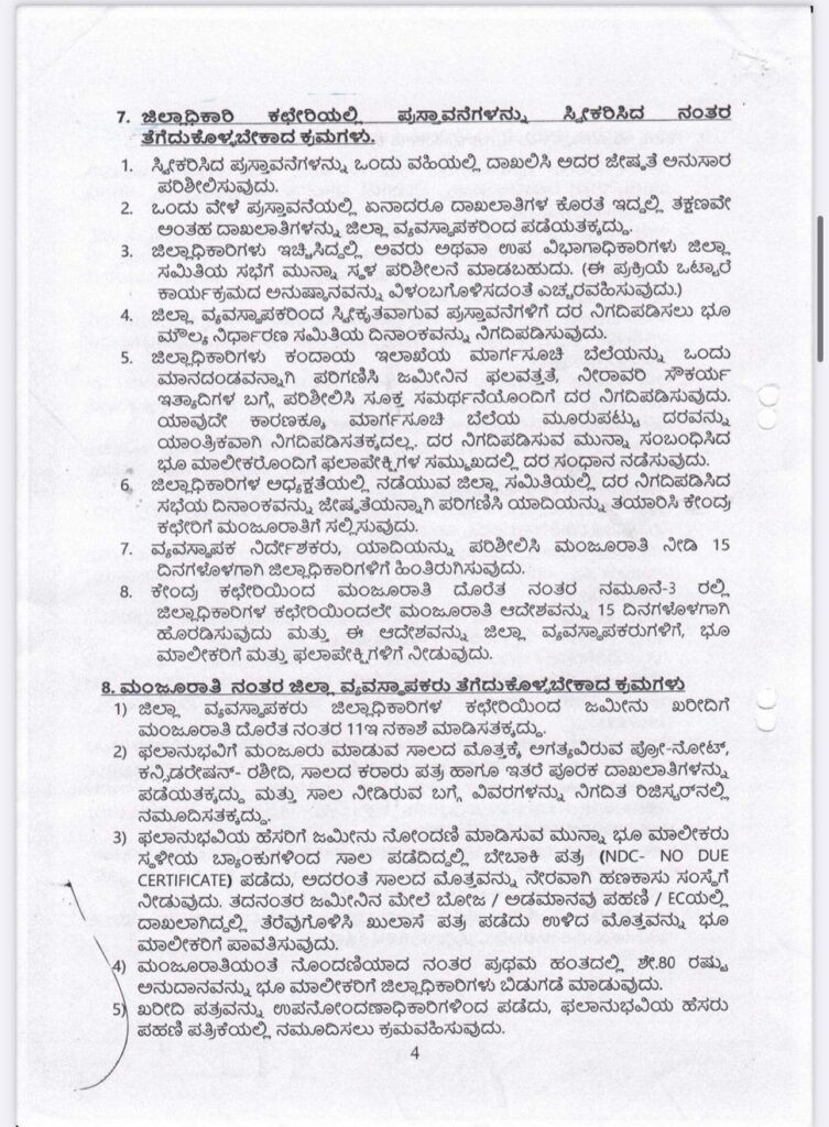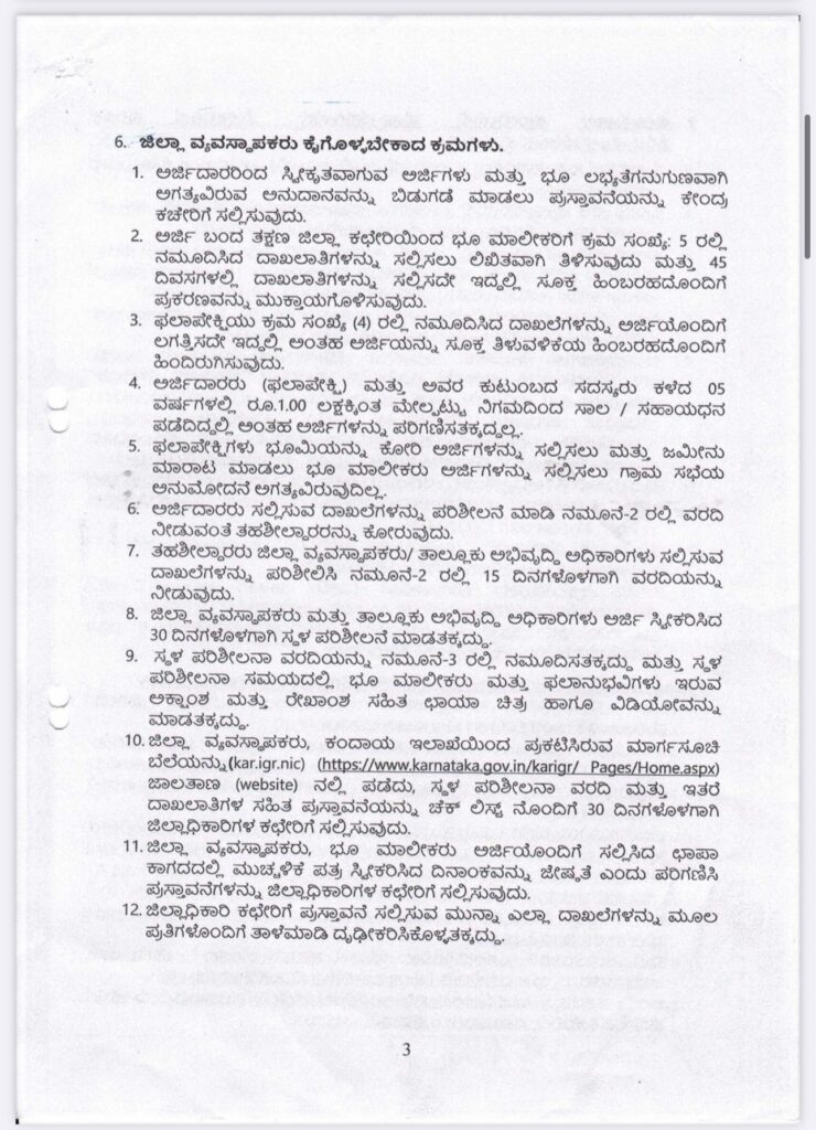 21. ಜಿಲ್ಲಾ ವ್ಯವಸ್ಥಾಪಕರು, ಕಂದಾಯ ಇಲಾಖೆಯಿಂದ ಪ್ರಕಟಿಸಿರುವ ಮಾರ್ಗಸೂಚಿ (kar.igr.nic) (https://www.karnataka.gov.in/karigr/Pages/Home.aspx) ಜಾಲತಾಣ (website) ನಲ್ಲಿ ಪಡೆದು, ಸ್ಥಳ ಪರಿಶೀಲನಾ ವರದಿ ಮತ್ತು ಇತರೆ ದಾಖಲಾತಿಗಳ ಸಹಿತ ಪ್ರಸ್ತಾವನೆಯನ್ನು ಚೆಕ್ ಲಿಸ್ಟ್ ನೊಂದಿಗೆ 30 ದಿನಗಳೊಳಗಾಗಿ ಜಿಲ್ಲಾಧಿಕಾರಿಗಳ ಕಛೇರಿಗೆ ಸಲ್ಲಿಸುವುದು.
