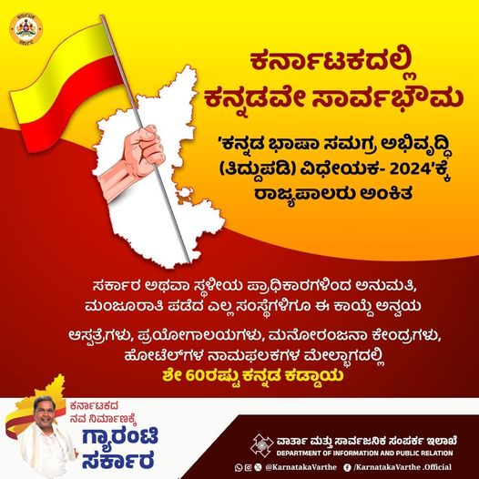 ಈ ಉದ್ದೇಶಕ್ಕೆ, ರಾಜ್ಯ ಸರ್ಕಾರ ಮಂಡಿಸಿ ಉಭಯ ಸದನಗಳಲ್ಲೂ ಅನುಮೋದನೆ ಪಡೆದಿದ್ದ ʼಕನ್ನಡ ಭಾಷಾ ಸಮಗ್ರ ಅಭಿವೃದ್ಧಿ (ತಿದ್ದುಪಡಿ) ವಿಧೇಯಕ- 2024ʼಕ್ಕೆ ರಾಜ್ಯಪಾಲರು ಅಂಕಿತ ಹಾಕಿದ್ದಾರೆ. ಅದರ ಬೆನ್ನಲ್ಲೇ, ಕರ್ನಾಟಕ ರಾಜ್ಯಪತ್ರದಲ್ಲಿ ಅಧಿಸೂಚನೆಯನ್ನೂ ಹೊರಡಿಸಲಾಗಿದೆ.