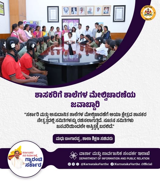 ಸರ್ಕಾರಿ ಮತ್ತು ಅನುದಾನಿತ ಶಾಲೆಗಳ ಮೇಲ್ವಿಚಾರಣೆಗೆ ಆಯಾ ಕ್ಷೇತ್ರದ ಶಾಸಕರ ನೇತೃತ್ವದಲ್ಲಿ ಸಮಿತಿಗಳನ್ನು ರಚಿಸಲಾಗುತ್ತಿದೆ. ನೂತನ ಸಮಿತಿಗಳು ಜನವರಿಯಿಂದಲೇ ಅಸ್ತಿತ್ವಕ್ಕೆ ಬರಲಿದೆ ಎಂದು ಶಾಲಾ ಶಿಕ್ಷಣ ಸಚಿವರಾದ ಮಧು ಬಂಗಾರಪ್ಪ ಅವರು ತಿಳಿಸಿದ್ದಾರೆ.