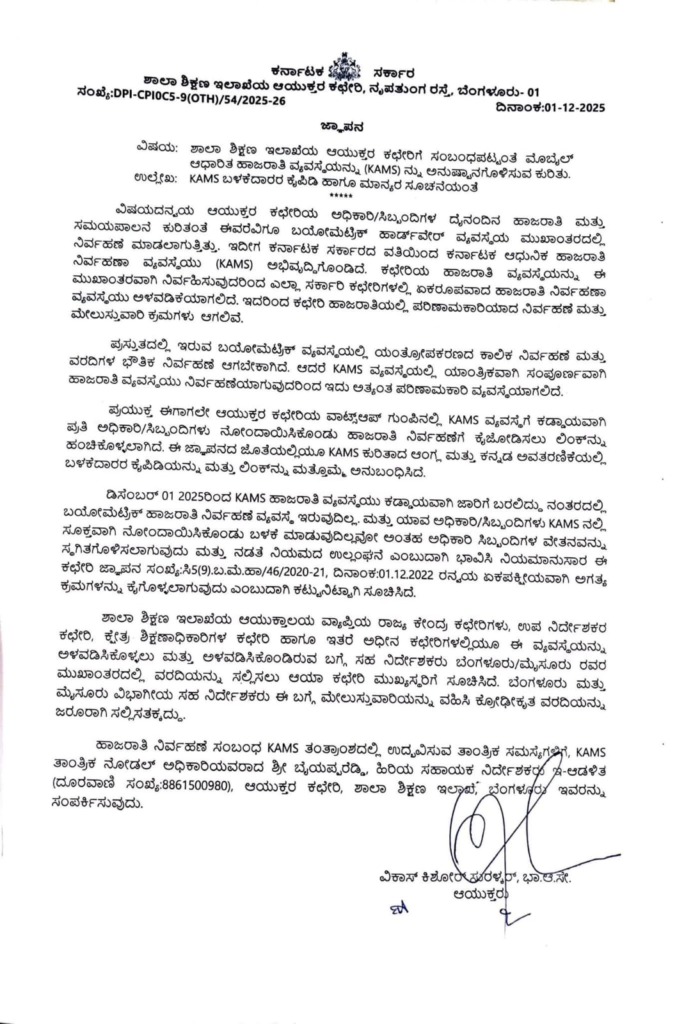 ಡಿಸೆಂಬರ್ 01 2025ರಿಂದ KAMS ಹಾಜರಾತಿ ವ್ಯವಸ್ಥೆಯು ಕಡ್ಡಾಯವಾಗಿ ಜಾರಿಗೆ ಬರಲಿದ್ದು ನಂತರದಲ್ಲಿ ಬಯೋಮೆಟ್ರಿಕ್ ಹಾಜರಾತಿ ನಿರ್ವಹಣೆ ವ್ಯವಸ್ಥೆ ಇರುವುದಿಲ್ಲ. ಮತ್ತು ಯಾವ ಅಧಿಕಾರಿ/ಸಿಬ್ಬಂದಿಗಳು KAMS ನಲ್ಲಿ ಸೂಕ್ತವಾಗಿ ನೋಂದಾಯಿಸಿಕೊಂಡು ಬಳಕೆ ಮಾಡುವುದಿಲ್ಲವೋ ಅಂತಹ ಅಧಿಕಾರಿ ಸಿಬ್ಬಂದಿಗಳ ವೇತನವನ್ನು ಸ್ಥಗಿತಗೊಳಿಸಲಾಗುವುದು ಮತ್ತು ನಡತೆ ನಿಯಮದ ಉಲ್ಲಂಘನೆ ಎಂಬುದಾಗಿ ಭಾವಿಸಿ ನಿಯಮಾನುಸಾರ ಈ ಕಛೇರಿ ಜ್ಞಾಪನ ಸಂಖ್ಯೆ:ಸಿ5(9).ಬ.ಮೆ.ಹಾ/46/2020-21, ದಿನಾಂಕ:01.12.2022 ರನ್ವಯ ಏಕಪಕ್ಷೀಯವಾಗಿ ಅಗತ್ಯ ಕ್ರಮಗಳನ್ನು ಕೈಗೊಳ್ಳಲಾಗುವುದು ಎಂಬುದಾಗಿ ಕಟ್ಟುನಿಟ್ಟಾಗಿ ಸೂಚಿಸಿದೆ.