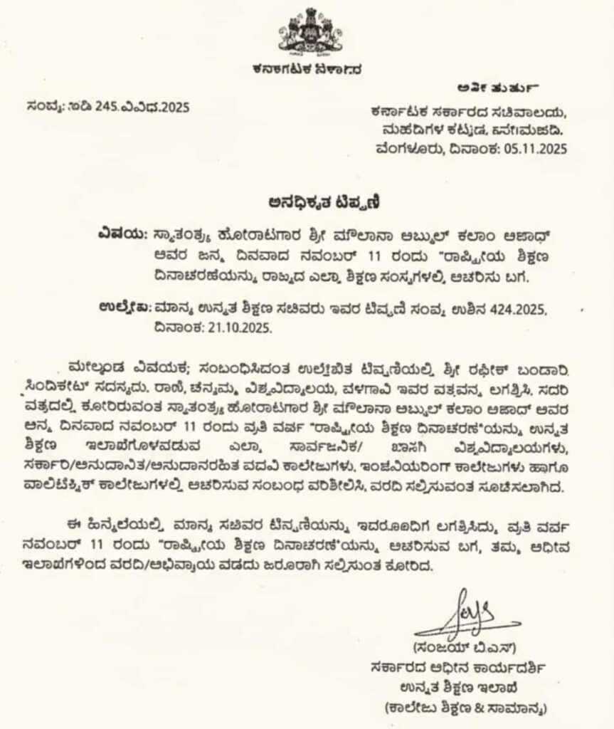 ಸ್ವಾತಂತ್ರ್ಯ ಹೋರಾಟಗಾರ ಶ್ರೀ ಮೌಲಾನಾ ಅಬ್ದುಲ್ ಕಲಾಂ ಅಜಾದ್ ಅವರ ಅನ್ನ ದಿನವಾದ ನವಂಬರ್ 11 ರಂದು ವ್ರತಿ ವರ್ಷ “ರಾಷ್ಟ್ರೀಯ ಶಿಕ್ಷಣ ದಿನಾಚರಣೆಯನ್ನು ಉನ್ನತ ಶಿಕ್ಷಣ ಇಲಾಖೆಗೊಳವಡುವ ಎಲ್ಲಾ ಸಾರ್ವಜನಿಕ/ ವಿಶ್ವವಿದ್ಯಾಲಯಗಳು, ಸರ್ಕಾರಿ/ಅನುದಾನಿತ/ಅನುದಾನರಹಿತ ವದವಿ ಕಾಲೇಜುಗಳು, ಇಂಜಿನಿಯರಿಂಗ್ ಕಾಲೇಜುಗಳು ಹಾಗೂ ವಾಲಿಟೆಕ್ನಿಕ್ ಕಾಲೇಜುಗಳಲ್ಲಿ ಆಚರಿಸುವ ಸಂಬಂಧ ವರಿಶೀಲಿಸಿ, ವರದಿ ಸಲ್ಲಿಸುವಂತೆ ಸೂಚಿಸಲಾಗಿದೆ.