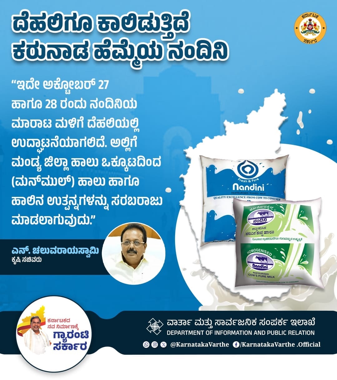 ಹೌದು, ಇದೇ ಅಕ್ಟೋಬರ್ 27 ಹಾಗೂ 28 ರಂದು ನಂದಿನಿಯ ಮಾರಾಟ ಮಳಿಗೆ ದೆಹಲಿಯಲ್ಲಿ ಉದ್ಘಾಟನೆಯಾಗಲಿದೆ. ಅಲ್ಲಿಗೆ ಮಂಡ್ಯ ಜಿಲ್ಲಾ ಹಾಲು ಒಕ್ಕೂಟದಿಂದ (ಮನ್ಮುಲ್) ಹಾಲು ಹಾಗೂ ಹಾಲಿನ ಉತ್ಪನ್ನಗಳನ್ನು ಸರಬರಾಜು ಮಾಡಲಾಗುವುದು ಎಂದು ಕೃಷಿ ಸಚಿವರಾದ ಎನ್. ಚಲುವರಾಯಸ್ವಾಮಿ ತಿಳಿಸಿದ್ದಾರೆ.