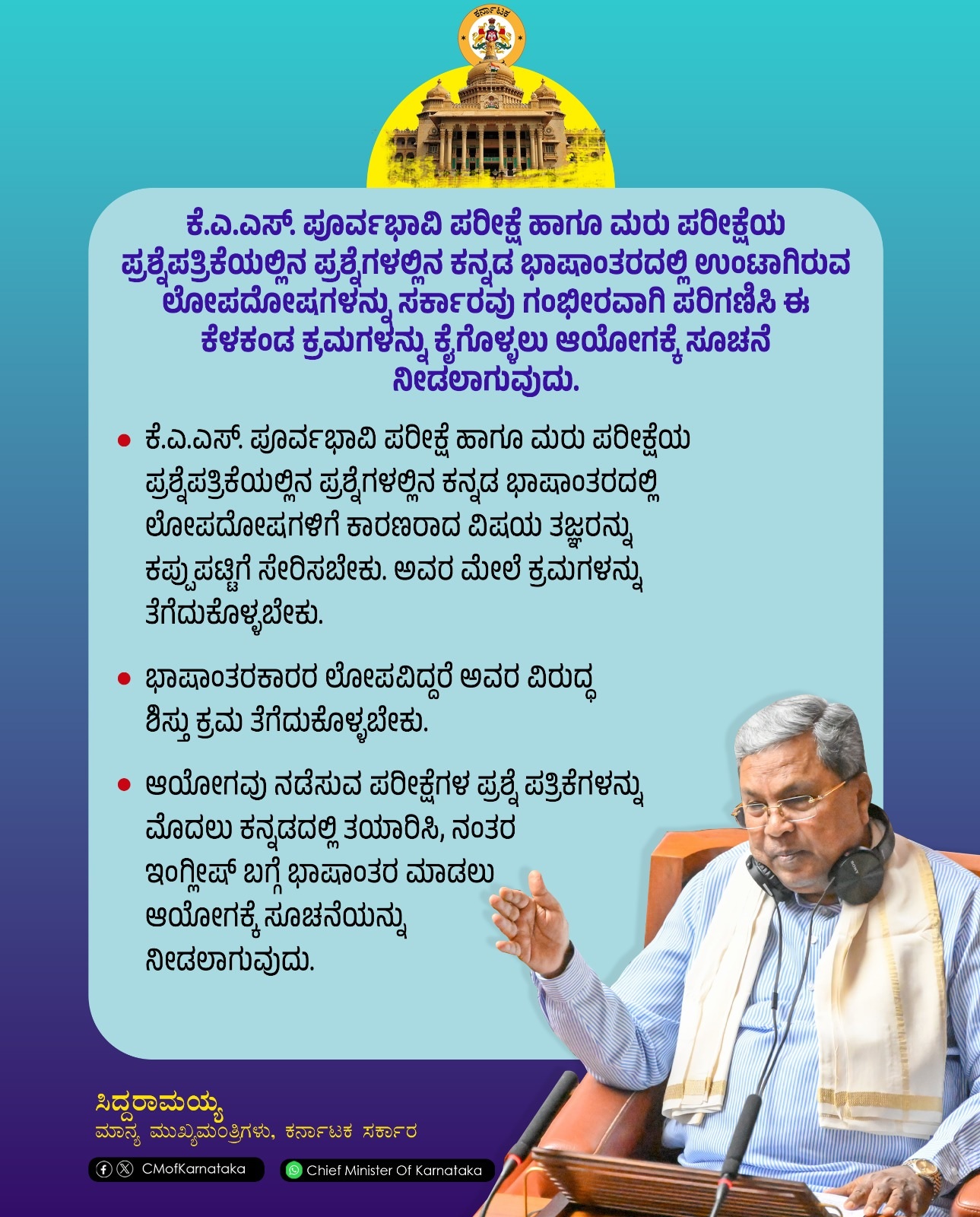 ಬೆಂಗಳೂರು : ಕೆ.ಎ.ಎಸ್. ಪೂರ್ವಭಾವಿ ಪರೀಕ್ಷೆ ಹಾಗೂ ಮರು ಪರೀಕ್ಷೆ ಪ್ರಶ್ನೆಪತ್ರಿಕೆಯ ಪ್ರಶ್ನೆಗಳಲ್ಲಿನ ಕನ್ನಡ ಭಾಷಾಂತರದಲ್ಲಿ ಉಂಟಾಗಿರುವ ಲೋಪದೋಷಗಳನ್ನು ಸರ್ಕಾರವು ಗಂಭೀರವಾಗಿ ಪರಿಗಣಿಸಿದ್ದು, ಈ ಕೆಳಕಂಡ ಕ್ರಮಗಳನ್ನು ಕೈಗೊಳ್ಳುವಂತೆ ಆಯೋಗಕ್ಕೆ ಸೂಚನೆ ನೀಡಲು ಸಿಎಂ ಸಿದ್ದರಾಮಯ್ಯ ನಿರ್ಧರಿಸಿದ್ದಾರೆ.