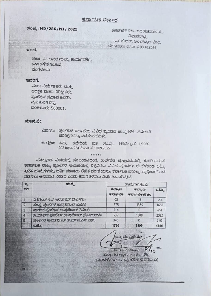 ಗೃಹ ಸಚಿವ ಡಾ. ಜಿ. ಪರಮೇಶ್ವರ್ ಈ ಬಗ್ಗೆ ಮಾಹಿತಿ ನೀಡಿದ್ದಾರೆ. 545 ಪಿಎಸ್ಐಗಳ ನೇಮಕಾತಿ, ತರಬೇತಿ ಪ್ರಗತಿಯಲ್ಲಿದ್ದು, ಹೊಸದಾಗಿ 402 ಪಿಎಸ್ಐ ನೇಮಕಾತಿಗೆ ಆದೇಶ ಹೊರಡಿಸಲಾಗಿದೆ. ಇದರೊಂದಿಗೆ ಇನ್ನೂ 600 ಪಿಎಸ್ಐ ಹುದ್ದೆಗಳಿಗೆ ನೇಮಕಾತಿ ಮಾಡಿಕೊಳ್ಳಲಾಗುವುದು. 4600 ಕಾನ್ಸ್ಟೇಬಲ್ ಗಳ ನೇಮಕಾತಿಗೆ ಅಧಿಸೂಚನೆ ಹೊರಡಿಸಲಾಗಿದೆ ಎಂದು ಮಾಹಿತಿ ನೀಡಿದ್ದಾರೆ.