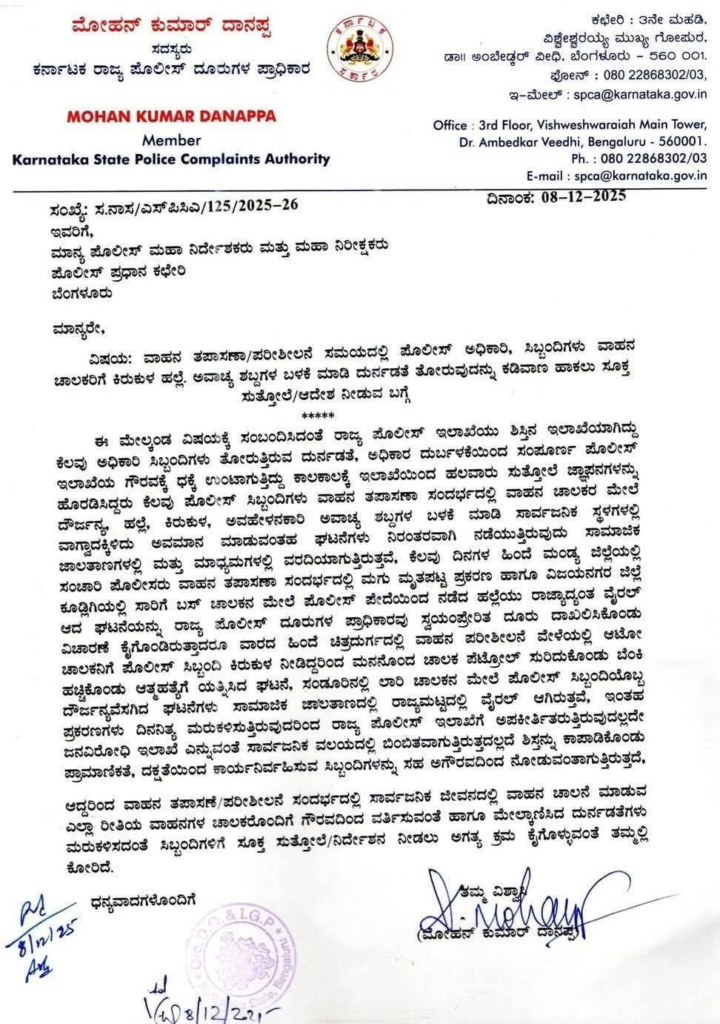 ಬೆಂಗಳೂರು : ವಾಹನ ತಪಾಸಣಾ/ಪರೀಶೀಲನೆ ಸಮಯದಲ್ಲಿ ಪೊಲೀಸ್ ಅಧಿಕಾರಿ, ಸಿಬ್ಬಂದಿಗಳು ವಾಹನ ಚಾಲಕರಿಗೆ ಕಿರುಕುಳ ಹಲ್ಲೆ. ಅವಾಚ್ಯ ಶಬ್ದಗಳ ಬಳಕೆ ಮಾಡಿ ದುರ್ನಡತೆ ತೋರುವುದನ್ನು ಕಡಿವಾಣ ಹಾಕಲು ಸೂಕ್ತ ಸುತ್ತೋಲೆ/ಆದೇಶ ನೀಡುವ ಬಗ್ಗೆ ಸುತ್ತೋಲೆ ಹೊರಡಿಸಲಾಗಿದೆ.
