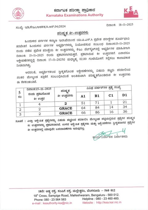 ನ.15ರಂದು ಲಿಖಿತ ಪರೀಕ್ಷೆಯನ್ನು ಆಯೋಜಿಸಲಾಗಿತ್ತು. ಕೀ ಉತ್ತರಗಳಿಗೆ ಬಂದಿದ್ದ ಆಕ್ಷೇಪಣೆಗಳನ್ನು ವಿಷಯ ತಜ್ಞರು ಪರಿಶೀಲಿಸಿದ ನಂತರ ಪರಿಷ್ಕೃತ ಕೀ ಉತ್ತರಗಳನ್ನು ಪ್ರಕಟಿಸಲಾಗಿದೆ ಎಂದು ಕರ್ನಾಟಕ ಪರೀಕ್ಷಾ ಪ್ರಾಧಿಕಾರದ ಕಾರ್ಯನಿರ್ವಾಹಕ ನಿರ್ದೇಶಕ ಹೆಚ್.ಪ್ರಸನ್ನ ತಿಳಿಸಿದ್ದಾರೆ.