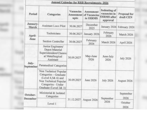ತಾತ್ಕಾಲಿಕ ವೇಳಾಪಟ್ಟಿಗೆ ಅನುಗುಣವಾಗಿ ಅವರ ತಯಾರಿಯನ್ನು ಯೋಜಿಸಲು ಮತ್ತು ವೇಗಗೊಳಿಸಲು ಅವರಿಗೆ ಸಹಾಯ ಮಾಡುತ್ತದೆ. ಅಧಿಕೃತ ಸೂಚನೆಯ ಪ್ರಕಾರ, ಎಲ್ಲಾ ವಲಯ ರೈಲ್ವೆಗಳು ಮತ್ತು ಉತ್ಪಾದನಾ ಘಟಕಗಳು ನಿಗದಿತ ಸಮಯದೊಳಗೆ ಆನ್ಲೈನ್ ಇಂಟಿಗ್ರೇಟೆಡ್ ರೈಲ್ವೆ ಮ್ಯಾನೇಜ್ಮೆಂಟ್ ಸಿಸ್ಟಮ್ (OIRMS) ಮೂಲಕ ತಮ್ಮ ಖಾಲಿ ಹುದ್ದೆಗಳ ವಿವರಗಳನ್ನು ನಿರ್ಣಯಿಸಲು ಮತ್ತು ಸಲ್ಲಿಸಲು ಸೂಚಿಸಲಾಗಿದೆ. ಕೇಂದ್ರೀಕೃತ ನೇಮಕಾತಿ ಪ್ರಕ್ರಿಯೆಯನ್ನು ಸುಗಮಗೊಳಿಸಲು ಮತ್ತು 2026 ರ ಪರೀಕ್ಷೆಗಳು ವಿಳಂಬವಿಲ್ಲದೆ ನಡೆಯುವಂತೆ ನೋಡಿಕೊಳ್ಳಲು ಈ ಕ್ರಮವು ಉದ್ದೇಶಿಸಿದೆ.