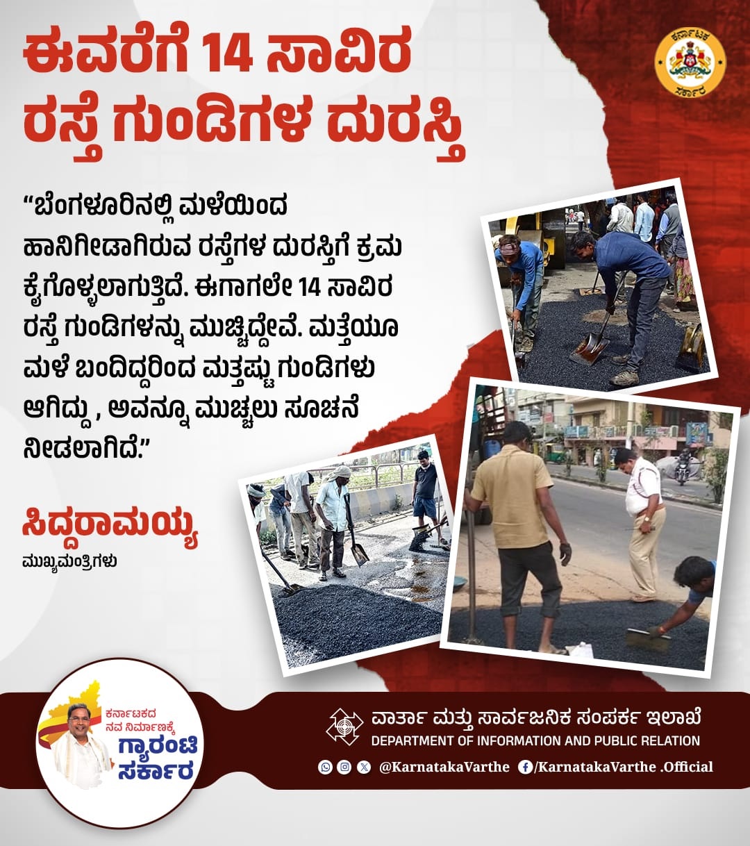 ಬೆಂಗಳೂರಿನಲ್ಲಿ ಇದುವರೆಗೆ 14 ಸಾವಿರ ರಸ್ತೆ ಗುಂಡಿಗಳ ದುರಸ್ಥಿ ಮಾಡಲಾಗಿದೆ ಮಳೆಯಿಂದ ಹಾನಿಗೀಡಾಗಿರುವ ರಸ್ತೆಗಳ ದುರಸ್ತಿಗೆ ಕ್ರಮ ಕೈಗೊಳ್ಳಲಾಗುತ್ತಿದೆ. ಈಗಾಗಲೇ 14 ಸಾವಿರ ರಸ್ತೆ ಗುಂಡಿಗಳನ್ನು ಮುಚ್ಚಿದ್ದೇವೆ. ಮತ್ತೆಯೂ ಮಳೆ ಬಂದಿದ್ದರಿಂದ ಮತ್ತಷ್ಟು ಗುಂಡಿಗಳು ಆಗಿದ್ದು, ಅವನ್ನೂ ಮುಚ್ಚಲು ಸೂಚನೆ ನೀಡಲಾಗಿದೆ ಎಂದು ಮುಖ್ಯಮಂತ್ರಿ ಸಿದ್ದರಾಮಯ್ಯ ಅವರು ತಿಳಿಸಿದ್ದಾರೆ.