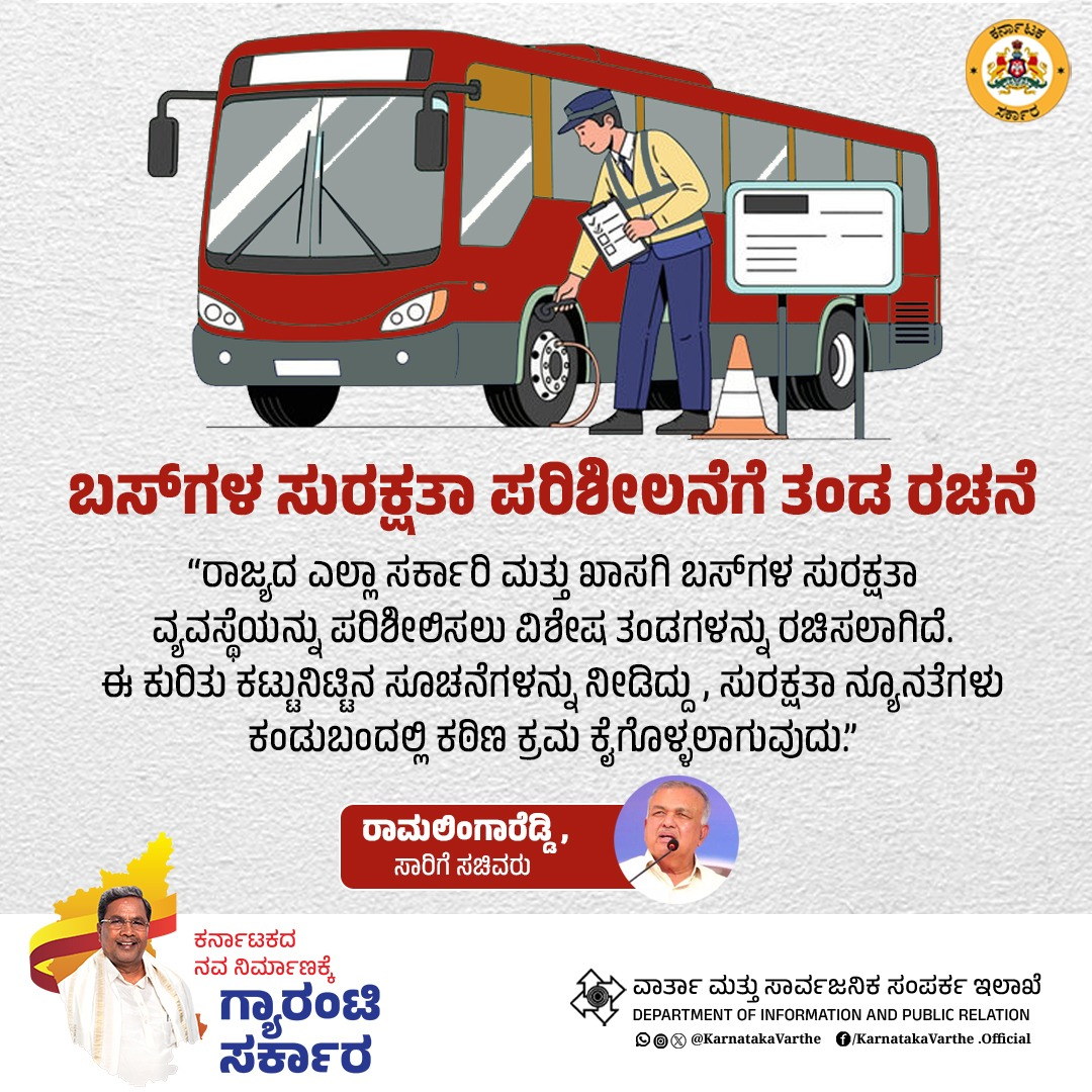 ರಾಜ್ಯದ ಎಲ್ಲಾ ಸರ್ಕಾರಿ ಮತ್ತು ಖಾಸಗಿ ಬಸ್ಗಳ ಸುರಕ್ಷತಾ ವ್ಯವಸ್ಥೆಯನ್ನು ಪರಿಶೀಲಿಸಲು ವಿಶೇಷ ತಂಡಗಳನ್ನು ರಚಿಸಲಾಗಿದೆ. ಈ ಕುರಿತು ಕಟ್ಟುನಿಟ್ಟಿನ ಸೂಚನೆಗಳನ್ನು ನೀಡಿದ್ದು, ಸುರಕ್ಷತಾ ನ್ಯೂನತೆಗಳು ಕಂಡುಬಂದಲ್ಲಿ ಕಠಿಣ ಕ್ರಮ ಕೈಗೊಳ್ಳಲಾಗುವುದು ಎಂದು ಸಾರಿಗೆ ಸಚಿವರಾದ ರಾಮಲಿಂಗಾರೆಡ್ಡಿ ತಿಳಿಸಿದ್ದಾರೆ.