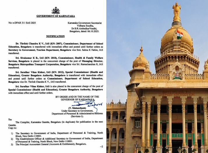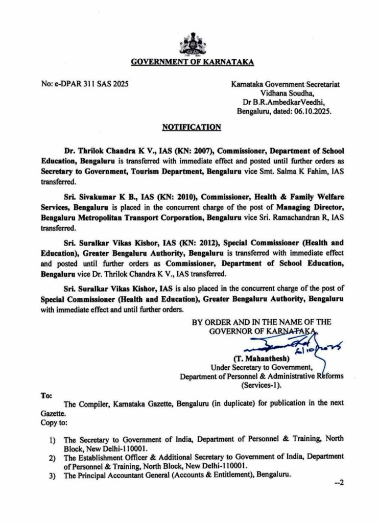 ಶ್ರೀ. ಸುರಲ್ಕರ್ ವಿಕಾಸ್ ಕಿಶೋರ್, ಐಎಎಸ್ (ಕೆಎನ್: 2012), ವಿಶೇಷ ಆಯುಕ್ತರು (ಆರೋಗ್ಯ ಮತ್ತು ಶಿಕ್ಷಣ), ಬೃಹತ್ ಬೆಂಗಳೂರು ಪ್ರಾಧಿಕಾರ, ಬೆಂಗಳೂರು ಅವರನ್ನು ತಕ್ಷಣದಿಂದ ಜಾರಿಗೆ ಬರುವಂತೆ ವರ್ಗಾಯಿಸಲಾಗಿದೆ ಮತ್ತು ಮುಂದಿನ ಆದೇಶದವರೆಗೆ ಬೆಂಗಳೂರಿನ ಶಾಲಾ ಶಿಕ್ಷಣ ಇಲಾಖೆಯ ಆಯುಕ್ತರಾಗಿ ಉಪಾಧ್ಯಕ್ಷ ಡಾ. ತ್ರಿಲೋಕ್ ಚಂದ್ರ ಕೆ ವಿ., ಐಎಎಸ್ ಅವರನ್ನು ವರ್ಗಾಯಿಸಲಾಗಿದೆ.
