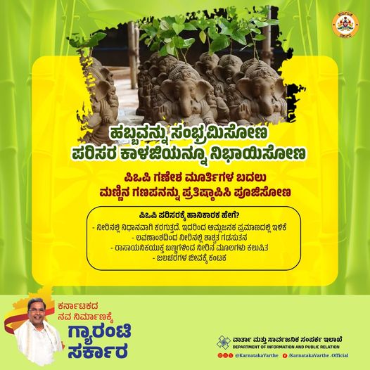 ಗಣೇಶ ಹಬ್ಬದಲ್ಲಿ ಪರಿಸರ ಸ್ನೇಹಿ ಗಣೇಶ ಮೂರ್ತಿಗಳ ಬಳಕೆ ಮತ್ತು ಪ್ಲಾಸ್ಟರ್ ಆಫ್ ಪ್ಯಾರಿಸ್ (ಪಿಒಪಿ) ಮೂರ್ತಿಗಳ ನಿಷೇಧವನ್ನು ಕಟ್ಟುನಿಟ್ಟಾಗಿ ಜಾರಿಗೊಳಿಸುವಂತೆ ಸಚಿವರು ಗುರುವಾರ ಎಲ್ಲಾ ಜಿಲ್ಲಾಡಳಿತಗಳಿಗೆ ಸೂಚಿಸಿದ್ದಾರೆ. ಪರಿಸರ ಸ್ನೇಹಿ ವಿಗ್ರಹಗಳನ್ನು ಉತ್ತೇಜಿಸಲು ಮತ್ತು ಹಸಿರು ಪಟಾಕಿಗಳ ಬಳಕೆಯನ್ನು ಉತ್ತೇಜಿಸಲು ಜಿಲ್ಲಾಧಿಕಾರಿಗಳ ಅಡಿಯಲ್ಲಿ ಸಮಿತಿಗಳನ್ನು ರಚಿಸಿ ಆದೇಶ ಹೊರಡಿಸಿದ್ದಾರೆ.ಇನ್ನೇನು ಕೆಲವೇ ದಿನಗಳಲ್ಲಿ ಗಣೇಶ ಹಬ್ಬ ಬರಲಿದೆ. ಈ ಬಾರಿ ಗಣೇಶ ಚತುರ್ಥಿಯನ್ನು ಮತ್ತಷ್ಟು ಸಂಭ್ರಮಿಸಲು ನಾಡಿನೆಲ್ಲೆಡೆ ತಯಾರಿಗಳು ಶುರುವಾಗಿವೆ.