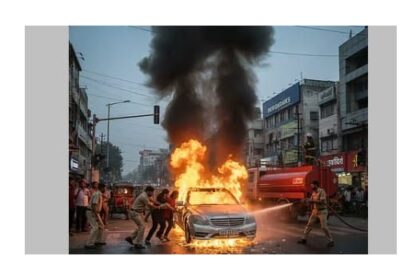 ರಸ್ತೆ ಮಧ್ಯೆಯೇ ಹೊತ್ತಿ ಉರಿದ ಬೆಂಜ್ ಕಾರು: ಮಹಿಳೆ ಹಾಗೂ ಮಗುವಿನ ರಕ್ಷಣೆ