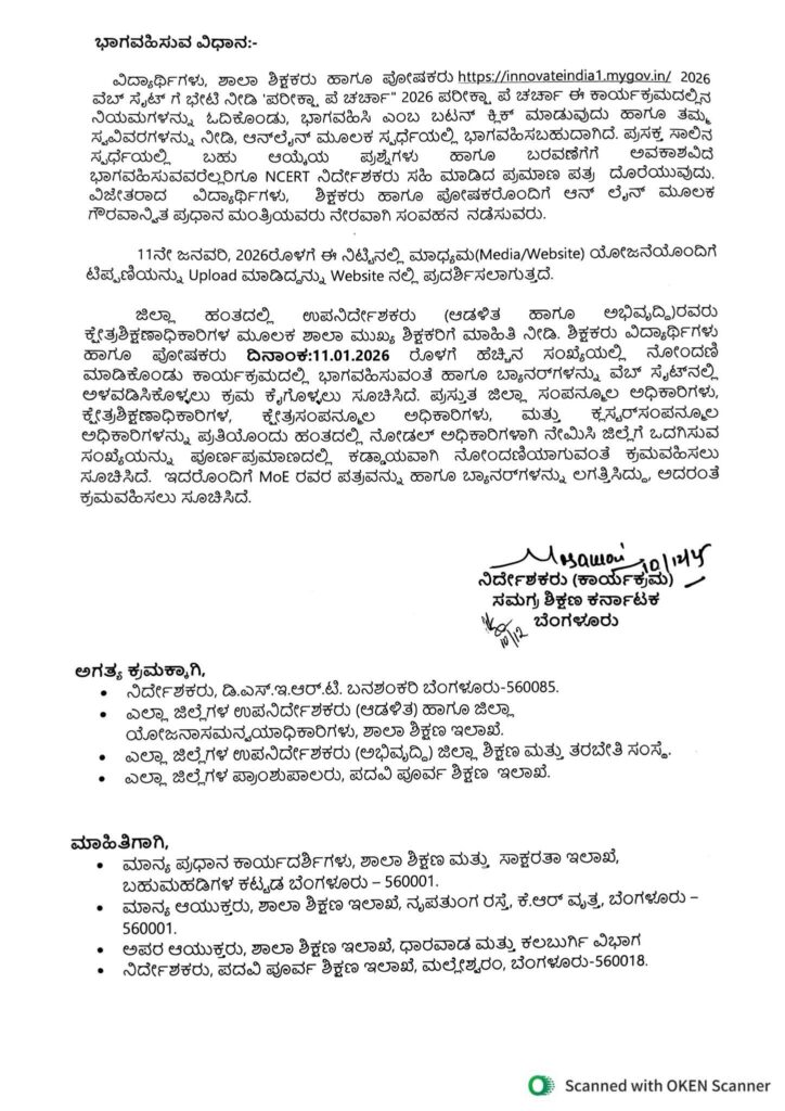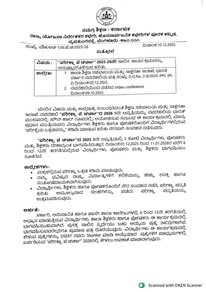 “ಪರೀಕ್ಷಾ ಪೆ ಚರ್ಚಾ”ದ 2025 8ನೇ ಆವೃತ್ತಿಯಲ್ಲಿ 5 ಕೋಟಿ ವಿದ್ಯಾರ್ಥಿಗಳು, ಪೋಷಕರು ಮತ್ತು ಶಿಕ್ಷಕರು ದೇಶಾದ್ಯಂತ ಭಾಗವಹಿಸಿರುತ್ತಾರೆ. ದಿನಾಂಕ:01.12.2025 ರಿಂದ 11.01.2026ರ ವರೆಗೆ 6 ರಿಂದ 12ನೇ ತರಗತಿಯಲ್ಲಿರುವ ವಿದ್ಯಾರ್ಥಿಗಳು, ಪೋಷಕರು ಮತ್ತು ಶಿಕ್ಷಕರು ಭಾಗವಹಿಸಲು ಸೂಚಿಸಿದೆ.