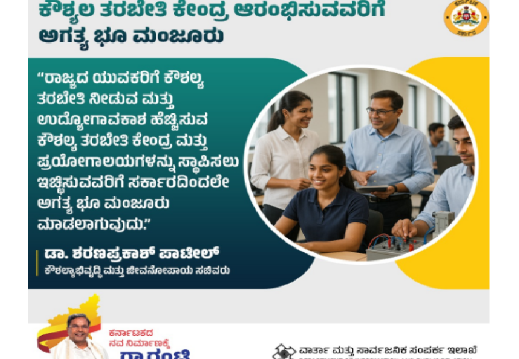 ರಾಜ್ಯದ ಯುವಕರಿಗೆ ಕೌಶಲ್ಯ ತರಬೇತಿ ನೀಡುವ ಮತ್ತು ಉದ್ಯೋಗಾವಕಾಶ ಹೆಚ್ಚಿಸುವ ಕೌಶಲ್ಯ ತರಬೇತಿ ಕೇಂದ್ರ ಮತ್ತು ಪ್ರಯೋಗಾಲಯಗಳನ್ನು ಸ್ಥಾಪಿಸಲು ಇಚ್ಛಿಸುವವರಿಗೆ ಸರ್ಕಾರದಿಂದಲೇ ಅಗತ್ಯ ಭೂ ಮಂಜೂರು ಮಾಡಲಾಗುವುದು ಎಂದು ಕೌಶಲ್ಯಾಭಿವೃದ್ಧಿ ಮತ್ತು ಜೀವನೋಪಾಯ ಸಚಿವರಾದ ಡಾ. ಶರಣಪ್ರಕಾಶ್ ಪಾಟೀಲ್ ತಿಳಿಸಿದ್ದಾರೆ.