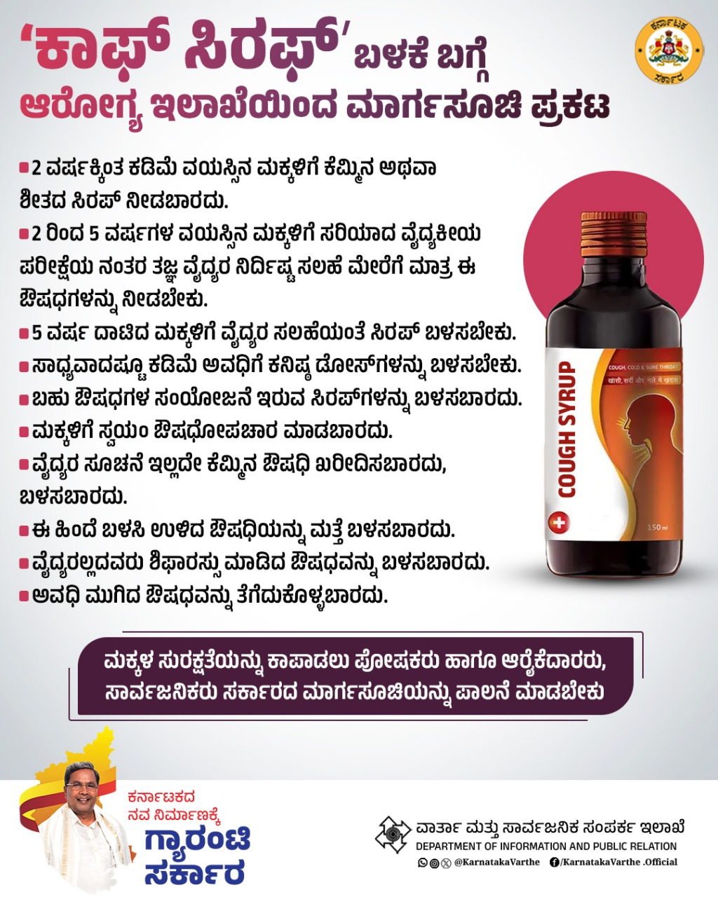 ʼಕಾಫ್ ಸಿರಫ್ʼ ಬಳಕೆ ಬಗ್ಗೆ ಆರೋಗ್ಯ ಇಲಾಖೆಯಿಂದ ಮಾರ್ಗಸೂಚಿ ಪ್ರಕಟಿಸಲಾಗಿದೆ.