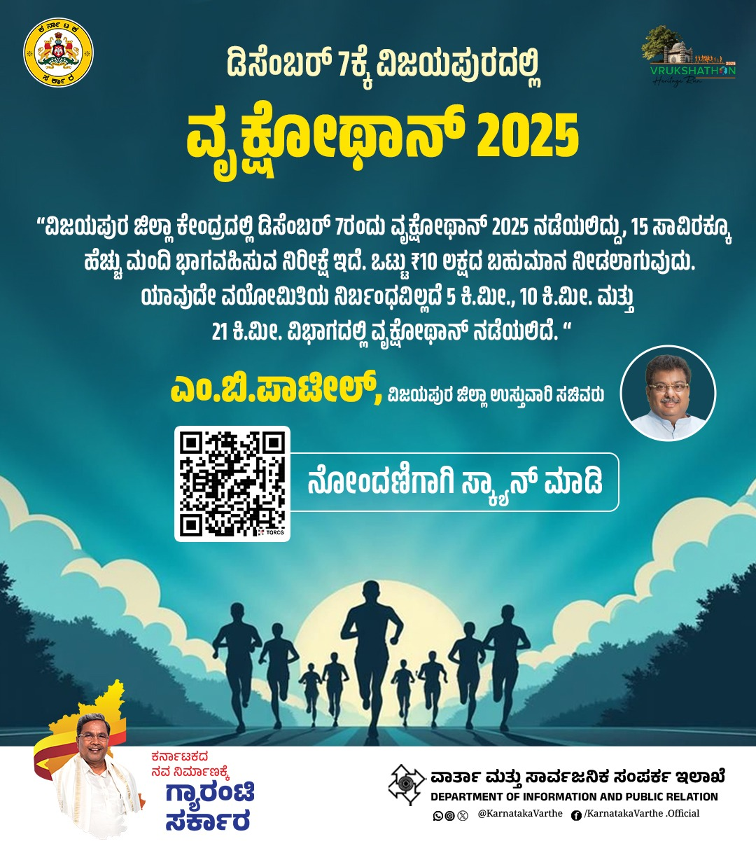 ಡಿಸೆಂಬರ್‌ 7ರಂದು ವೃಕ್ಷೋಥಾನ್‌ 2025 ನಡೆಯಲಿದ್ದು  ಒಟ್ಟು ₹10 ಲಕ್ಷದ ಬಹುಮಾನ ನೀಡಲಾಗುವುದು. ಯಾವುದೇ ವಯೋಮಿತಿಯ ನಿರ್ಬಂಧವಿಲ್ಲದೆ 5 ಕಿ.ಮೀ., 10 ಕಿ.ಮೀ. ಮತ್ತು 21 ಕಿ.ಮೀ. ವಿಭಾಗದಲ್ಲಿ ವೃಕ್ಷೋಥಾನ್‌ ನಡೆಯಲಿದೆ. ಆಸಕ್ತರು https://vrukshathon.co.in/ ಮೂಲಕ ನೋಂದಾಯಿಸಿಕೊಳ್ಳಬಹುದು ಎಂದು ವಿಜಯಪುರ ಜಿಲ್ಲಾ ಉಸ್ತುವಾರಿ ಸಚಿವರಾದ ಎಂ.ಬಿ.ಪಾಟೀಲ್‌ ತಿಳಿಸಿದ್ದಾರೆ.