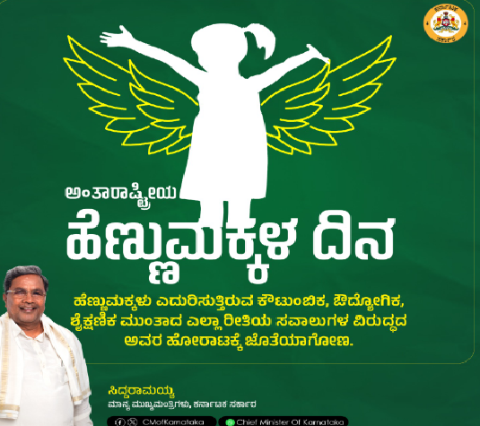 ಬೆಂಗಳೂರು : ಹೆಣ್ಣು ಸಂಸಾರದ ಕಣ್ಣು ಮಾತ್ರವಲ್ಲ, ಸಮಾಜದ ಶಕ್ತಿ ಎಂದು ಸಿಎಂ ಸಿದ್ದರಾಮಯ್ಯ ಅಂತಾರಾಷ್ಟ್ರೀಯ ಹೆಣ್ಣುಮಕ್ಕಳ ದಿನದ ಶುಭಾಶಯ ಕೋರಿದ್ದಾರೆ.